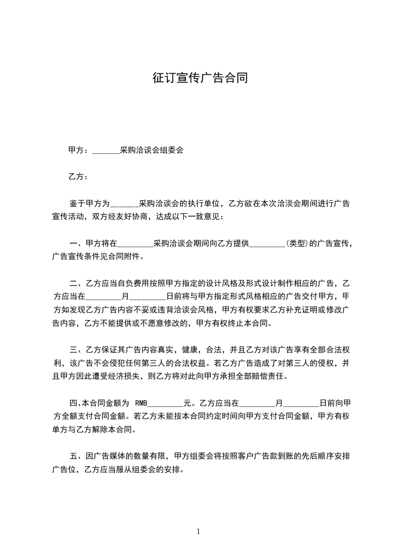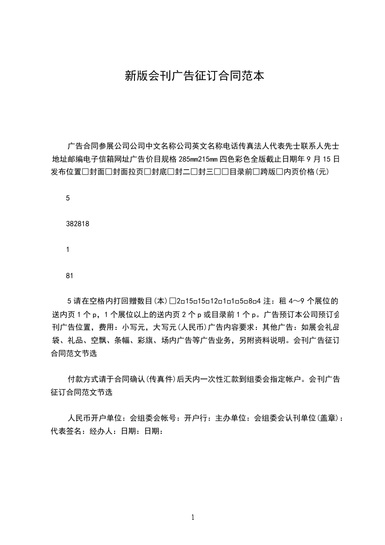 5请在空格内打回赠数目(本)□2□15□15□12□1□1□5□8□4注:租4~9个展位的送内页1个p,1个展位以上的送内页2个p或目录前1个p。广告预订本公司预订会刊广告位置,费用:小写元,大写元(人民币)广告内容要求:其他广告:如展会礼品袋、礼品、空飘、条幅、彩旗、场内广告等广告业务,另附资料说明。会刊广告征订合同范文节选