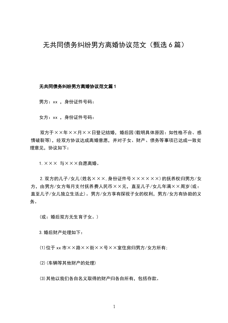 1、甲乙双方确认在婚姻关系存续期间无共同债务;