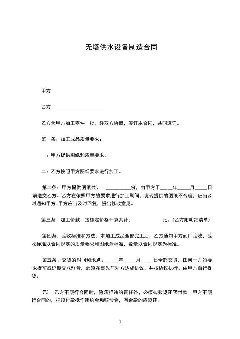 二:乙方逾期交付加工件的,应当向甲方偿付违约金,每逾期一天,按甲方向乙方给付预付款:_____________________元(大写:____________________________。