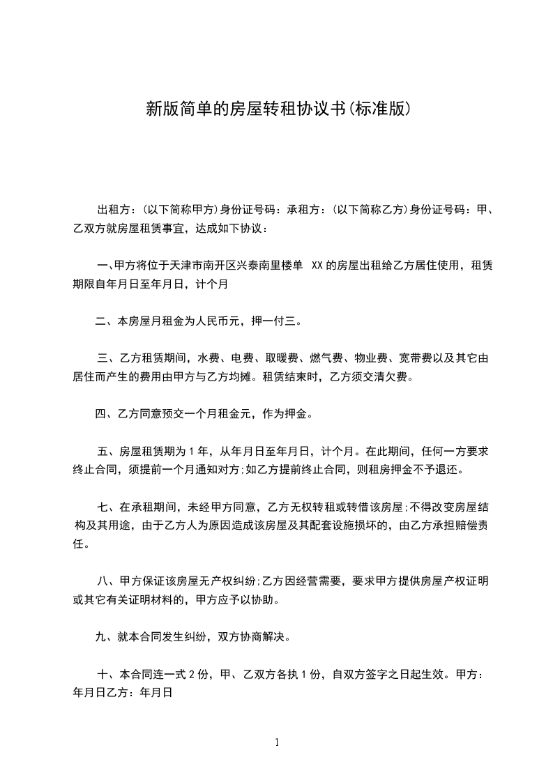 一、甲方将位于天津市南开区兴泰南里楼单XX的房屋出租给乙方居住使用,租赁期限自年月日至年月日,计个月