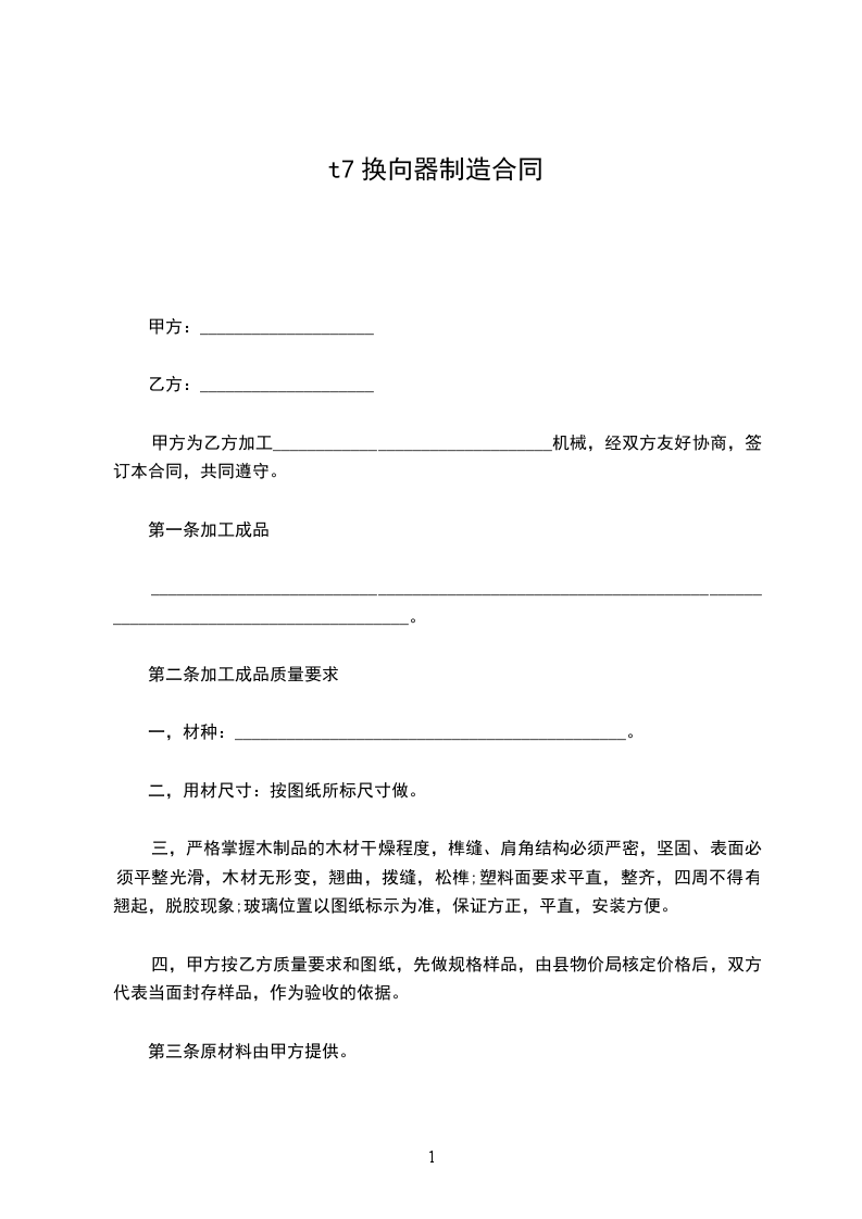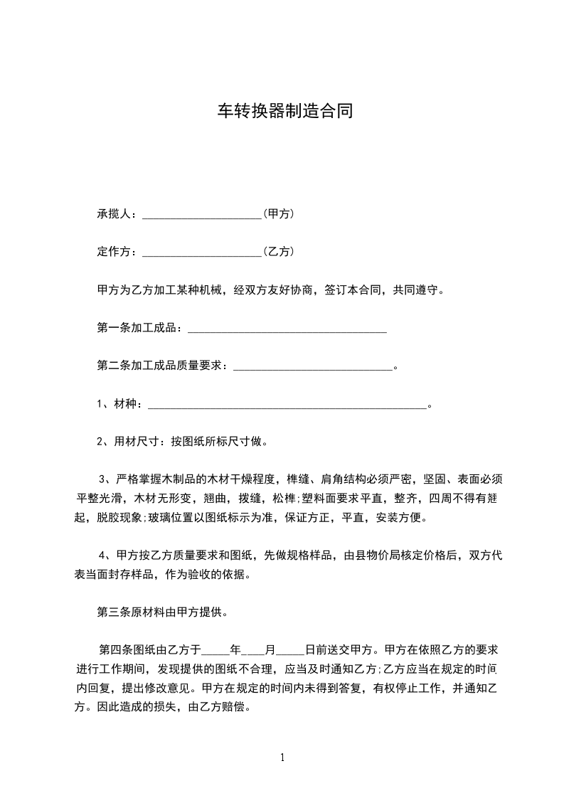 六、乙加工所需要的车床、量具、刀具、夹具、检验设备等其他设备均有乙自己购置,如需甲代制作、代购,乙需按照甲合理提出的价格等金额的支付。甲目前提供的车床从_________月_________日起终止。乙加工所需的原材料有甲提供,乙加工后的副产物(铁屑、铝屑等)由乙作为乙成本计入利润进行核算。