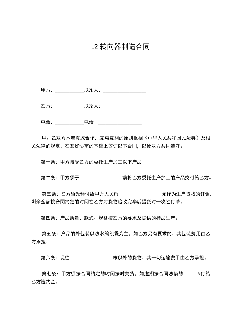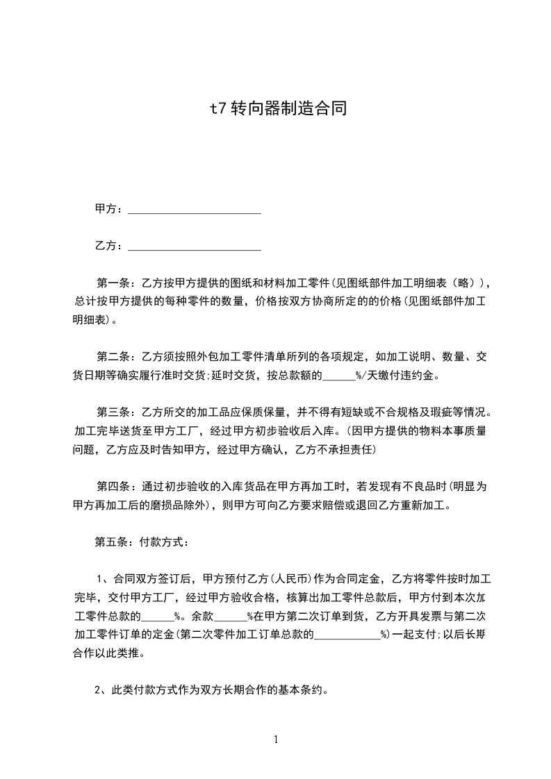 一、甲托乙加工生产之产品为出口液压件等系列产品,乙保证按甲乙双方确定的托加工订单和甲提供的图纸要求进行加工。