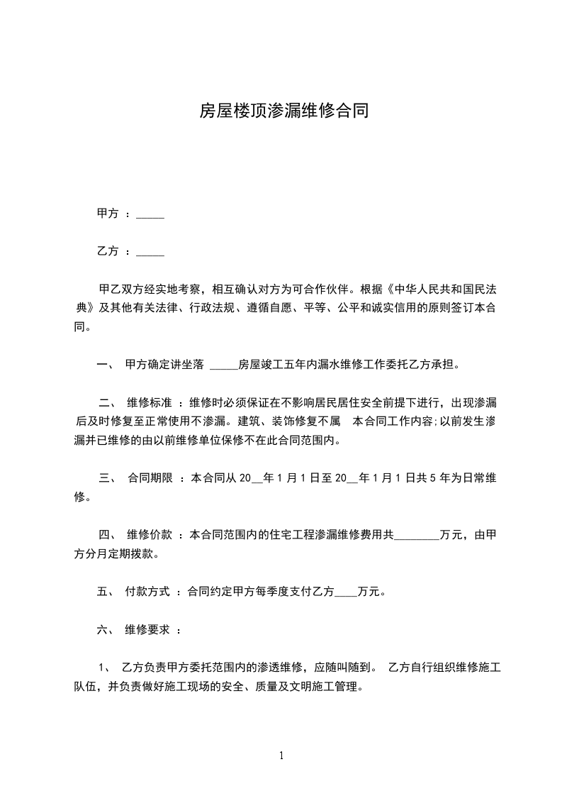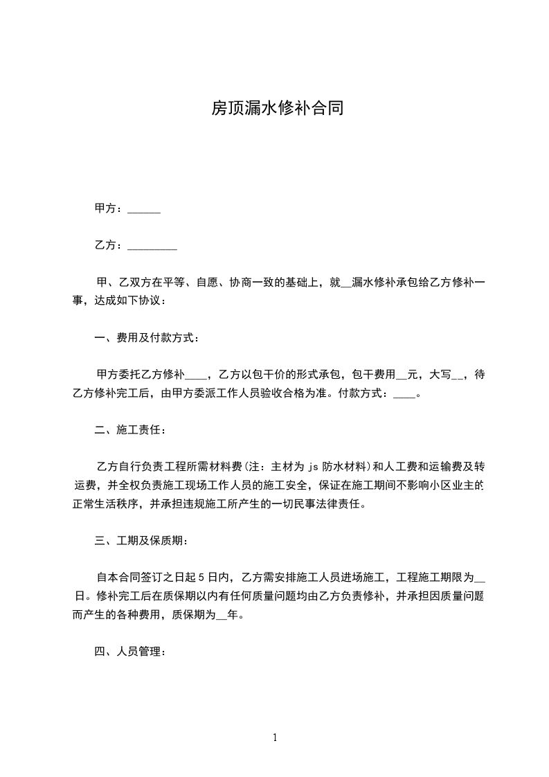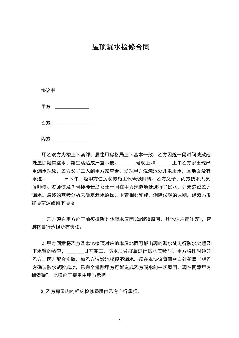 一、对于甲方房屋漏水造成乙方房顶的水印和渗水问题,经双方达成协议,由甲方一次性支付给乙方维修费壹仟元(未含乙方因处理此事而另外损失的误工费、交通费、通讯费以及维修后所需清洁费等费用)。