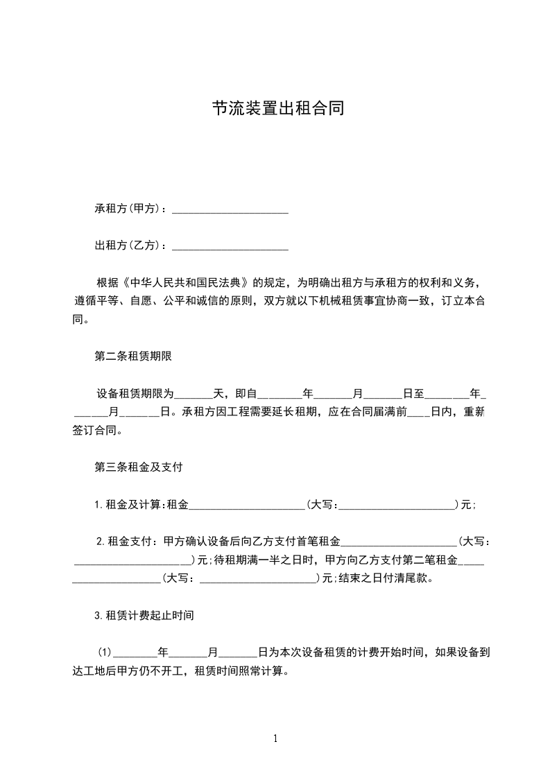 根据《中华人民共和国民法典》的规定,为明确出租方与承租方的权利和义务,遵循平等、自愿、公平和诚信的原则,双方就以下机械租赁事宜协商一致,订立本合同。