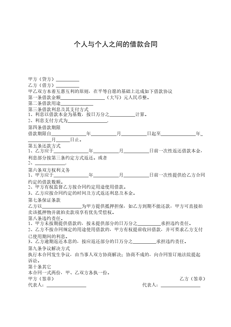 甲方(贷方)__________ 乙方(借方)__________ 甲乙双方本着互惠互利的原则,在平等自愿的基础上达成如下借款协议 第一条借款金额___________________(大写)元人民币整。 第二条借款用途______________ 第三条借款利息及其支付方式 1、利息以借款本金为基数,按日万分之___________计算。 2、利息支付方式为_________________. 第四条借款期限 借款期限自_______________年___________月___________日起至_______________年___________月______日止。 第五条还款方式 1、乙方应于_______________年___________月___________日前一次性返还借款本金,利息部分按第三条约定方式返还。或者 2、_____________. 第六条双方权利义务 1、甲方应于_______________年___________月___________日前一次性提供给乙方合同约定的借款数额。 2、甲方有权监督乙方按合同约定用途使用借款。 3、乙方应按合同约定的时间及方式返还利息及本金。 第七条保证条款 乙方以_________________为甲方提供抵押担保,如乙方到期不能还款,甲方可直接拍卖该抵押物并就拍卖款项享有优先受偿权。 第八条违约责任。 1、甲方未按期提供借款的,按未提供部分的日万分之__________承担违约责任。 2、乙方不按合同规定的用途使用借款的,甲方有权提前收回借款,并可要求乙方支付已使用期间的利息。 3、乙方逾期返还本息的,按应返还部分的日万分之__________承担违约责任。 第九条争议解决方式 执行本合同发生争议,由当事人双方协商解决;协商不成的,向合同签订地法院提起诉讼。 第十条其它 本合同一式两份,甲、乙双方各执一份。 甲方(签章) 乙方(签章) 代表人:_________________ 代表人:_________________ _______________年_____月____日 ____________年______月____日 合同签订地:_________________
