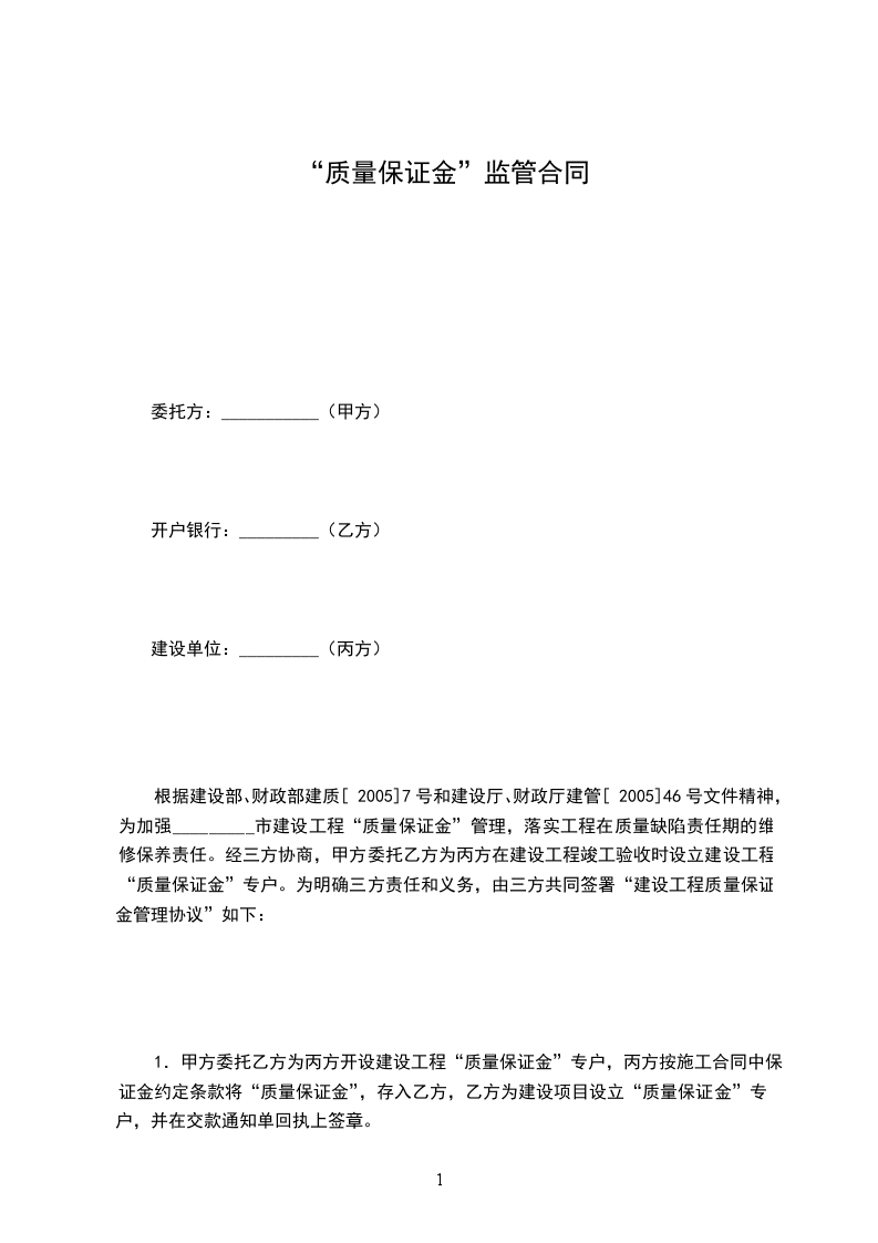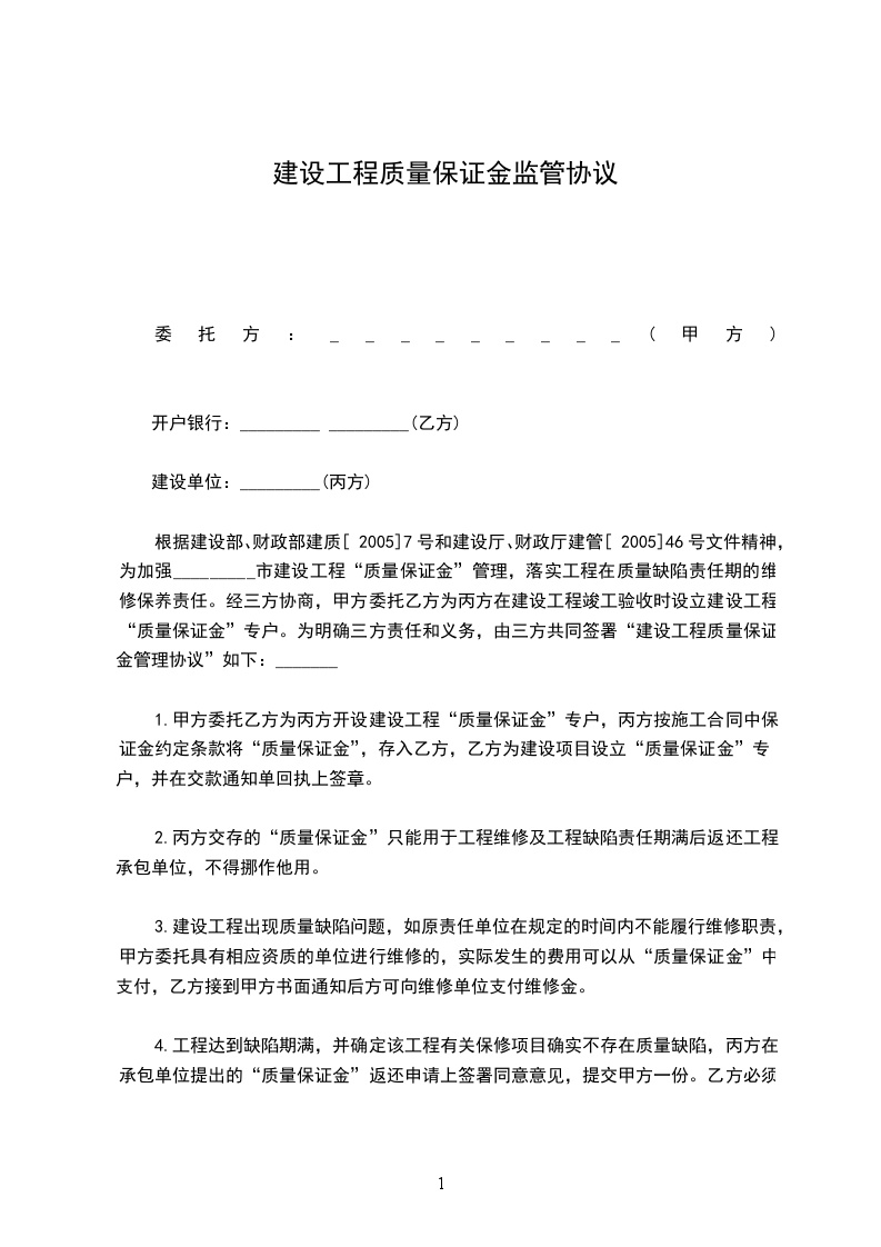 根据建设部、财政部建质[2005]7号和建设厅、财政厅建管[2005]46号文件精神,为加强_________市建设工程“质量保证金”管理,落实工程在质量缺陷责任期的维修保养责任。经三方协商,甲方委托乙方为丙方在建设工程竣工验收时设立建设工程“质量保证金”专户。为明确三方责任和义务,由三方共同签署“建设工程质量保证金管理协议”如下: