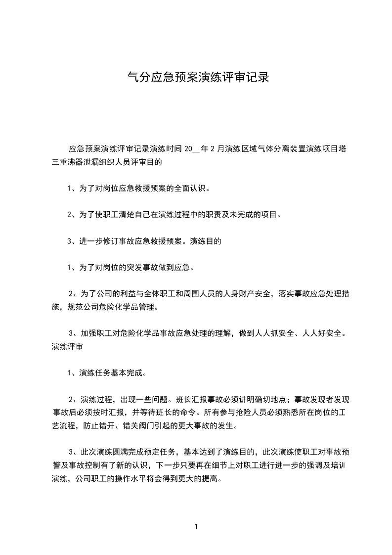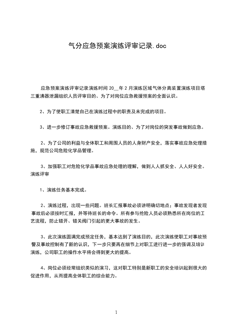 文件评审修订记录表编号:评审修改制度名称评审修改日期评审修改原因评审修订负责部门评审修改内容新制度教育培训培训部门负责人:新制度实施情况相关部门负责人:批准部门意见企业主管负责人:文件评审修订记录表编号:2024-01评审修改制度名称安全生产费用提取和使用管理制度评审修改日期201_.1.1评审修改原因企业安全生产标准化基本规范发布实施评审修订负责部门财务部评审修改内容安全生产费用适用于以下生产事项5.3.1完善、改造和维护安全防护设备设施;5.3.2安全生产教育培训和配备劳动防护用品;5.3.3安全评价、重大危险源监控、事故隐患评估和整改;5.3.4职业危害防治,职业危害因素监测、事故隐患和职业健康体检;5.3.5设备设施安全性能检测检验;5.3.6应急救援器材、装备的配备及应急救援演练;5.3.7安全标志和标识;5.3.8其他和安全生产直接相关的物品或者活动。修改人:新制度教育培训已落实新制度的具体教育培训工作培训部门负责人:新制度实施情况经核查已落实,并形成记录相关部门负责人:批准部门意见同意进行修改,并递交总经理进行签发企业主管负责人:文件评审修订记录表编号:2024-02评审修改制度名称有关人员、机构、工艺、技术、设施、作业过程及环境变更的管理制度评审修改日期201_.1.1评审修改原因企业安全生产标准化基本规范发布实施评审修订负责部门财务部评审修改内容4.2.1工艺设备变更范围包括:(1)生产能力的改变。(2)物料的改变(包括成分比例的变化)。(3)设备、设施负荷的改变。(4)工艺设备设计依据的改变。(5)设备和工具的改变或改进。(6)工艺参数的改变(如温度、流量、压力等)。(7)安全报警设定值的改变。(8)仪表控制系统及逻辑的改变。(9)软件系统的改变。(10)安全装置及安全联锁的改变。(11)非标准的(或临时性的)维修。修改人:新制度教育培训已落实新制度的具体教育培训工作培训部门负责人:新制度实施情况经核查已落实,并形成记录相关部门负责人:批准部门意见同意进行修改,并递交总经理进行签发企业主管负责人:文件评审修订记录表编号:2024-03评审修改制度名称绩效评定管理制度评审修改日期201_.1.1评审修改原因企业安全生产标准化基本规范发布实施评审修订负责部门财务部评审修改内容3.1企业领导:组织安委会全体成员参与,按职责进行明确分工,确定评定各环节的主要负责人,并协调各部门积极参与到评定工作中;3.2安全生产主管部门:是企业评定的主管部门和具体组织实施部门。在创建初期,经过一段时间企业安全标准化管理系统的运行后,即可组织进行评定。在通过标准化评定后,每年实施落实至少一次的企业标准化自主评定工作。主要职责:负责编制安全生产标准化绩效评定方案和报告;监督检查各单位安全生产标准化自评工作;督促各相关部门制定纠正和预防措施计划,并跟踪实施情况;负责安全生产标准化绩效评定工作相关记录的分发、保存和建档;根据评定结果和安全预警信息提出持续改进意见和工作规划。3.3各职能主管部门和生产单位:对分管专业进行绩效评定,形成分管专业安全生产标准化绩效评定分级报告,上报公司安全管理部门。修改人:新制度教育培训已落实新制度的具体教育培训工作培训部门负责人:新制度实施情况经核查已落实,并形成记录相关部门负责人:批准部门意见同意进行修改,并递交总经理进行签发企业主管负责人: