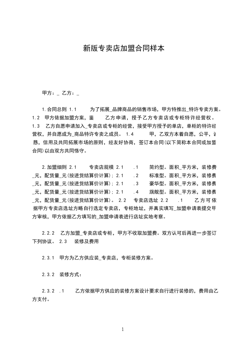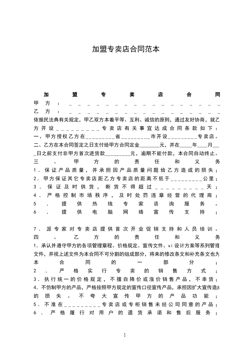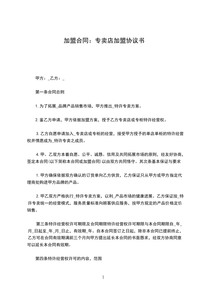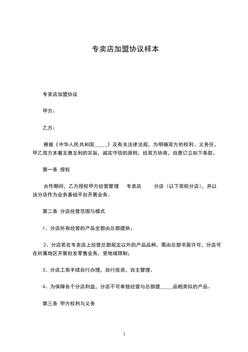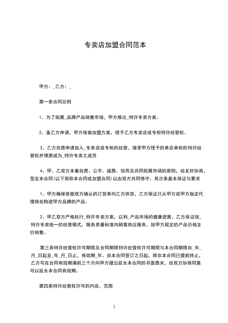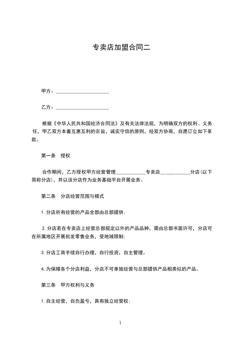 依据民法典有关规定,甲乙双方本着平等、互利、诚信的原则,通过友好协商,就乙方开设_________专卖店有关事宜达成合同条款如下: