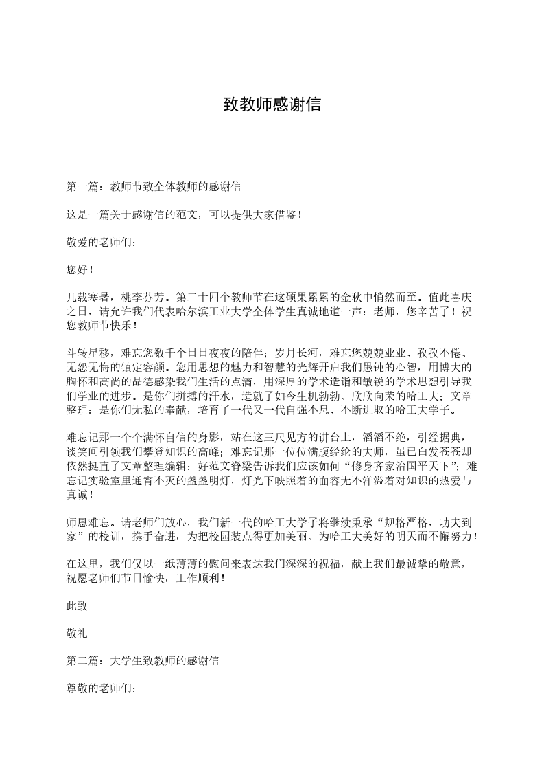 几载寒暑,桃李芬芳,教师节学生会致全体教师的感谢信范文。来源:范文中国www.第二十四个教师节在这硕果累累的金秋中悄然而至。值此喜庆之日,请允许我们代表哈尔滨工业大学全体学生真诚地道一声:老师,您辛苦了!祝您教师节快乐!