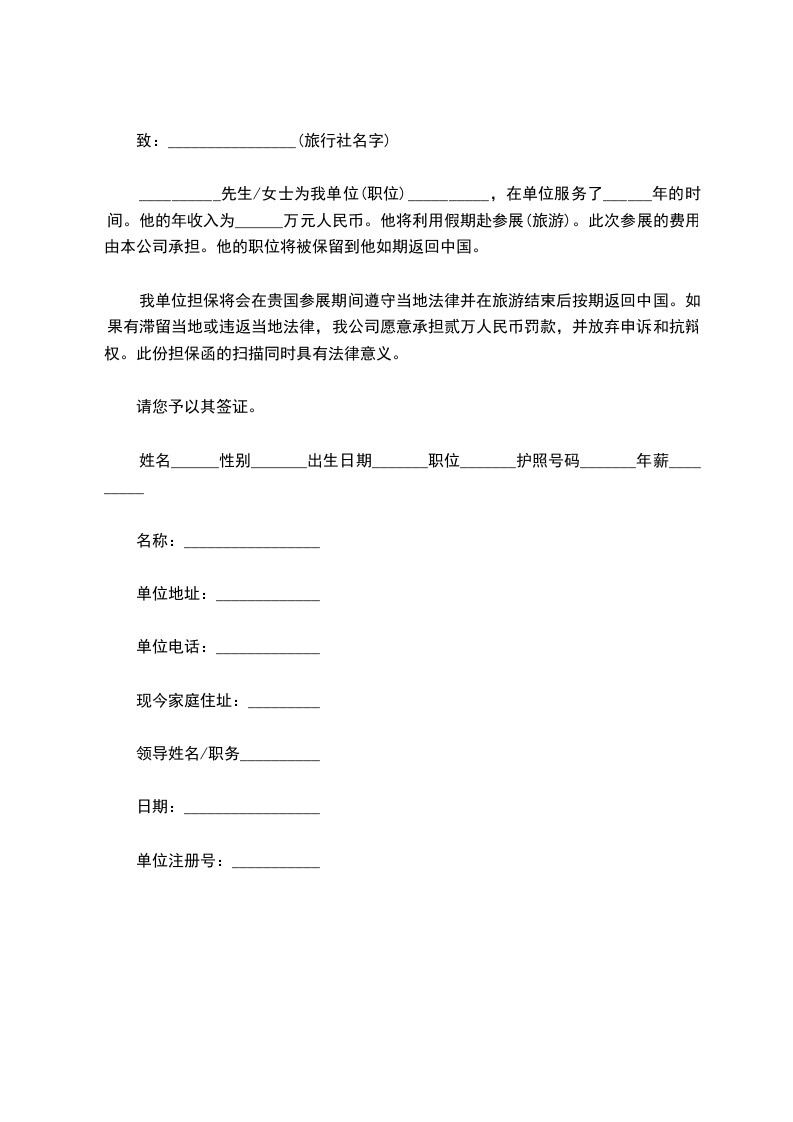 __________先生/女士为我单位(职位)__________,在单位服务了______年的时间。他的年收入为______万元人民币。他将利用假期赴参展(旅游)。此次参展的费用由本公司承担。他的职位将被保留到他如期返回中国。