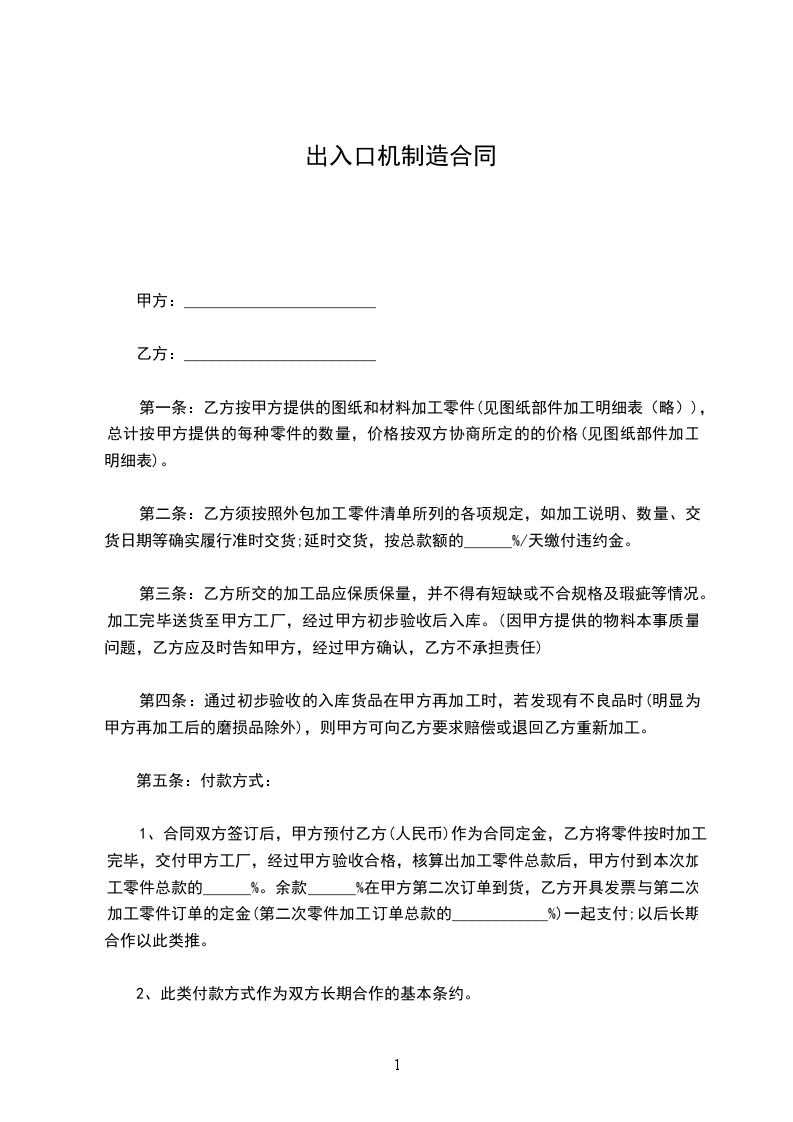 一、甲托乙加工生产之产品为出口液压件等系列产品,乙保证按甲乙双方确定的托加工订单和甲提供的图纸要求进行加工。