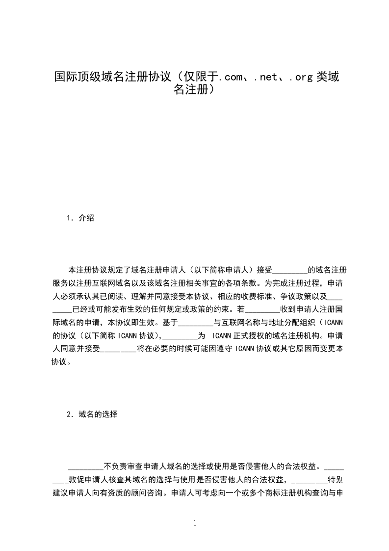 本注册协议规定了域名注册申请人(以下简称申请人)接受_________的域名注册服务以注册互联网域名以及该域名注册相关事宜的各项条款。为完成注册过程,申请人必须承认其已阅读、理解并同意接受本协议、相应的收费标准、争议政策以及_________已经或可能发布生效的任何规定或政策的约束。若_________收到申请人注册国际域名的申请,本协议即生效。基于_________与互联网名称与地址分配组织(ICANN)的协议(以下简称ICANN协议),_________为ICANN正式授权的域名注册机构。申请人同意并接受_________将在必要的时候可能因遵守ICANN协议或其它原因而变更本协议。