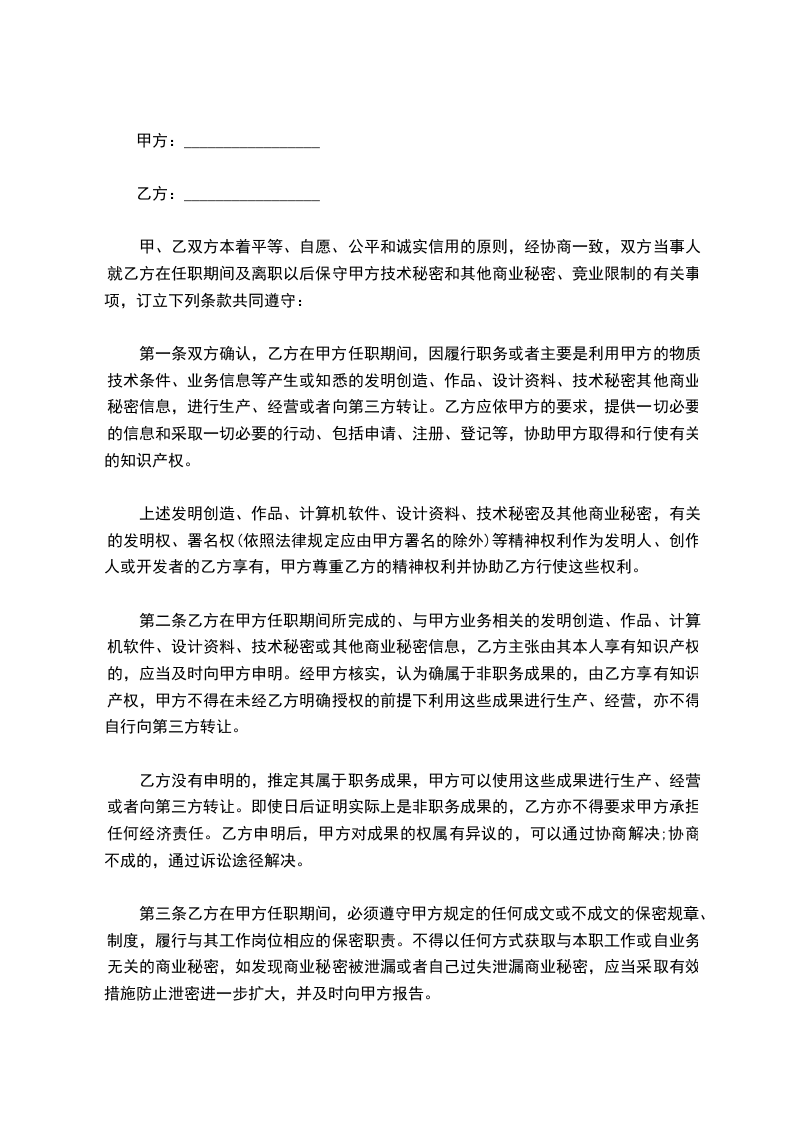 甲、乙双方本着平等、自愿、公平和诚实信用的原则,经协商一致,双方当事人就乙方在任职期间及离职以后保守甲方技术秘密和其他商业秘密、竞业限制的有关事项,订立下列条款共同遵守: