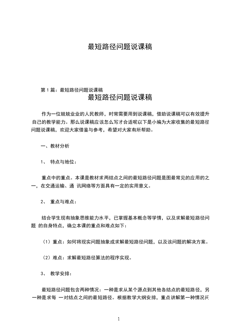 作为一位兢兢业业的人民教师,时常需要用到说课稿,借助说课稿可以有效提升自己的教学能力。那么说课稿应该怎么写才合适呢以下是小编为大家收集的最短路径问题说课稿,欢迎大家借鉴与参考,希望对大家有所帮助。