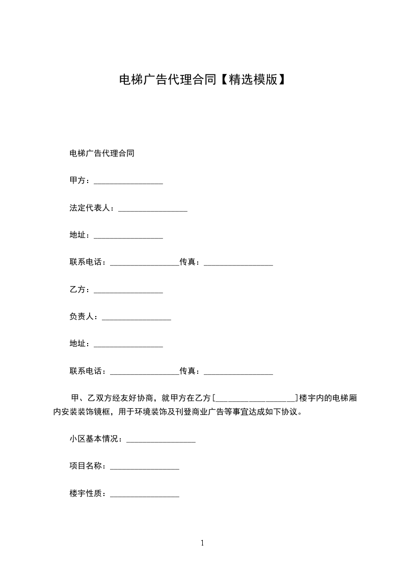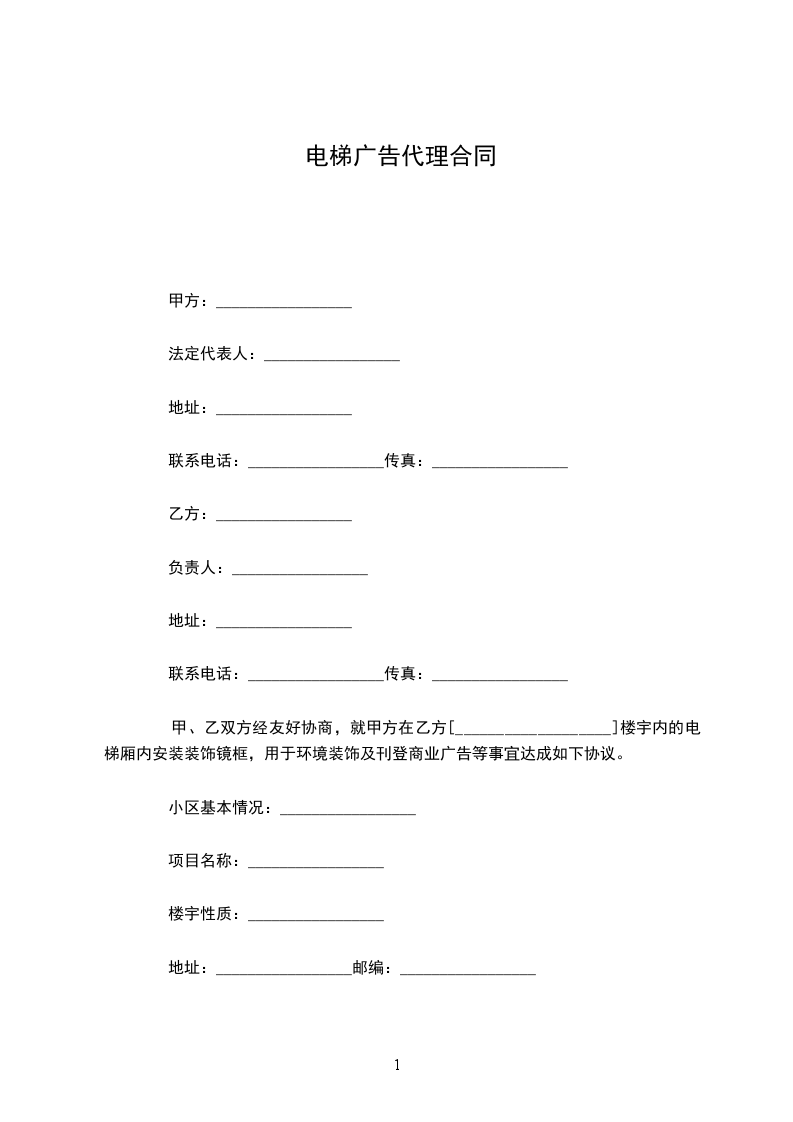 甲、乙双方经友好协商,就甲方在乙方[___________________]楼宇内的电梯厢内安装装饰镜框,用于环境装饰及刊登商业广告等事宜达成如下协议。