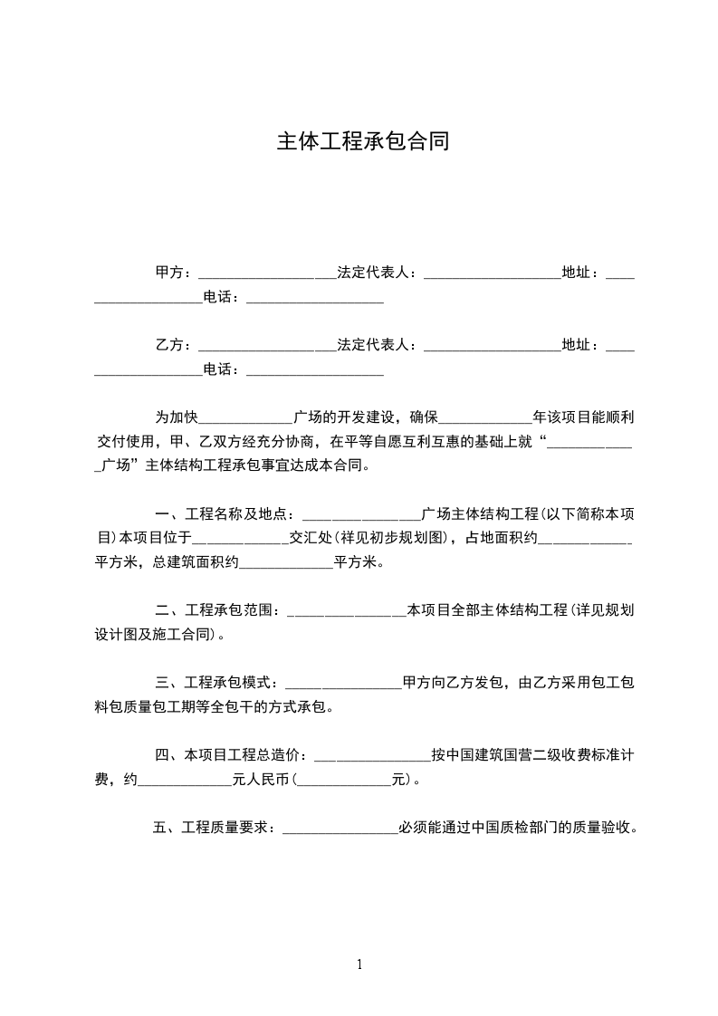 为加快_____________广场的开发建设,确保_____________年该项目能顺利交付使用,甲、乙双方经充分协商,在平等自愿互利互惠的基础上就“_____________广场”主体结构工程承包事宜达成本合同。
