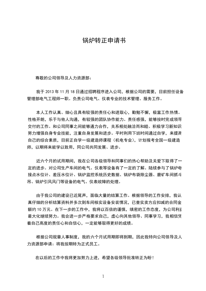 根据公司规章人事制度,我的六个月试用期即将到期,因此我特向公司领导及人力资源部申请:将我按期转为正式员工。