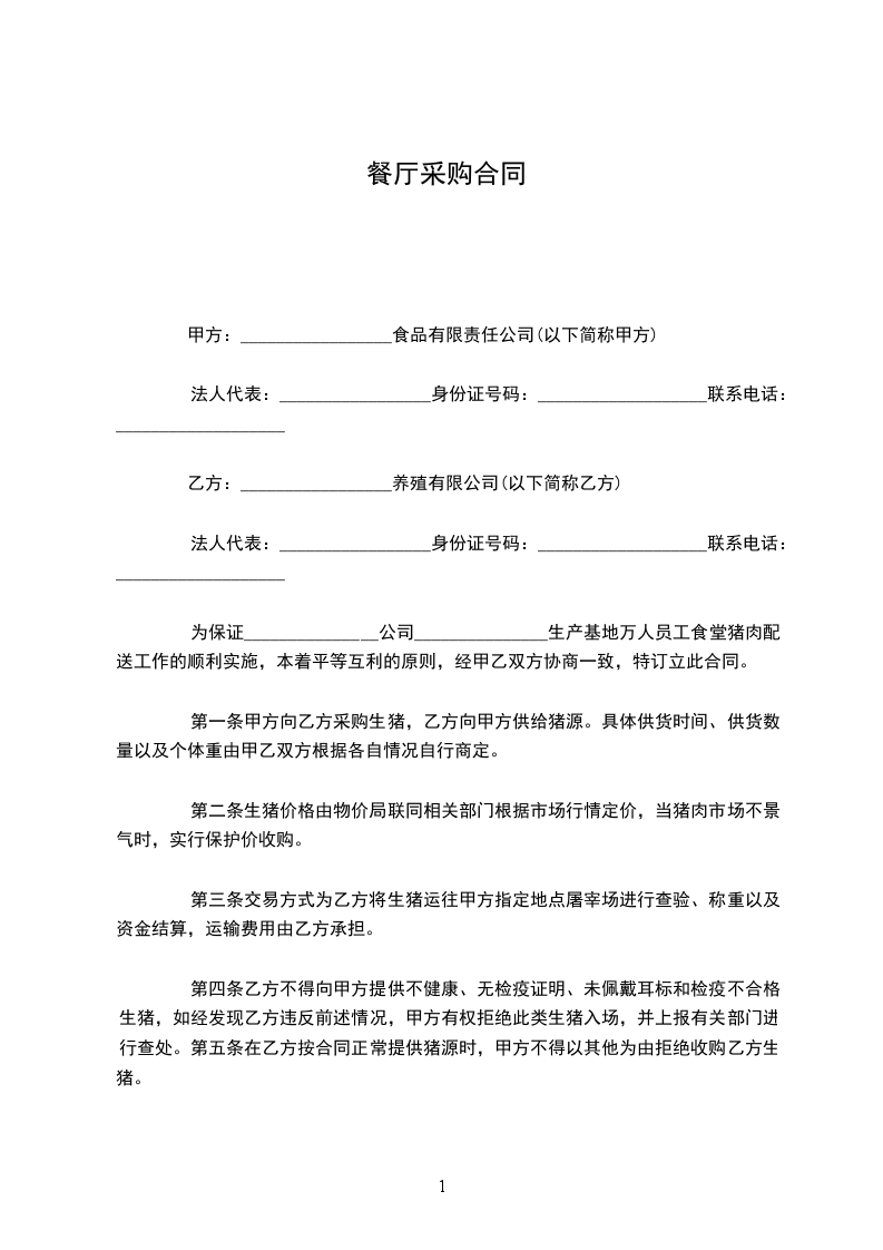 第一条甲方向乙方采购生猪,乙方向甲方供给猪源。具体供货时间、供货数量以及个体重由甲乙双方根据各自情况自行商定。