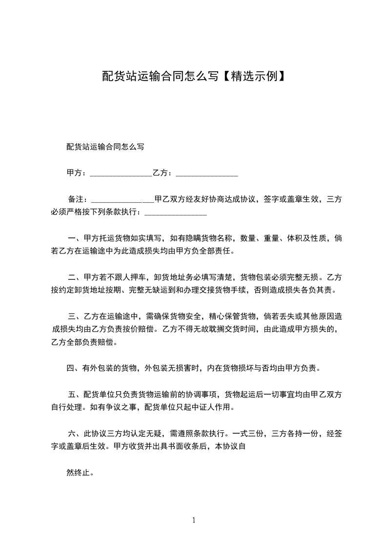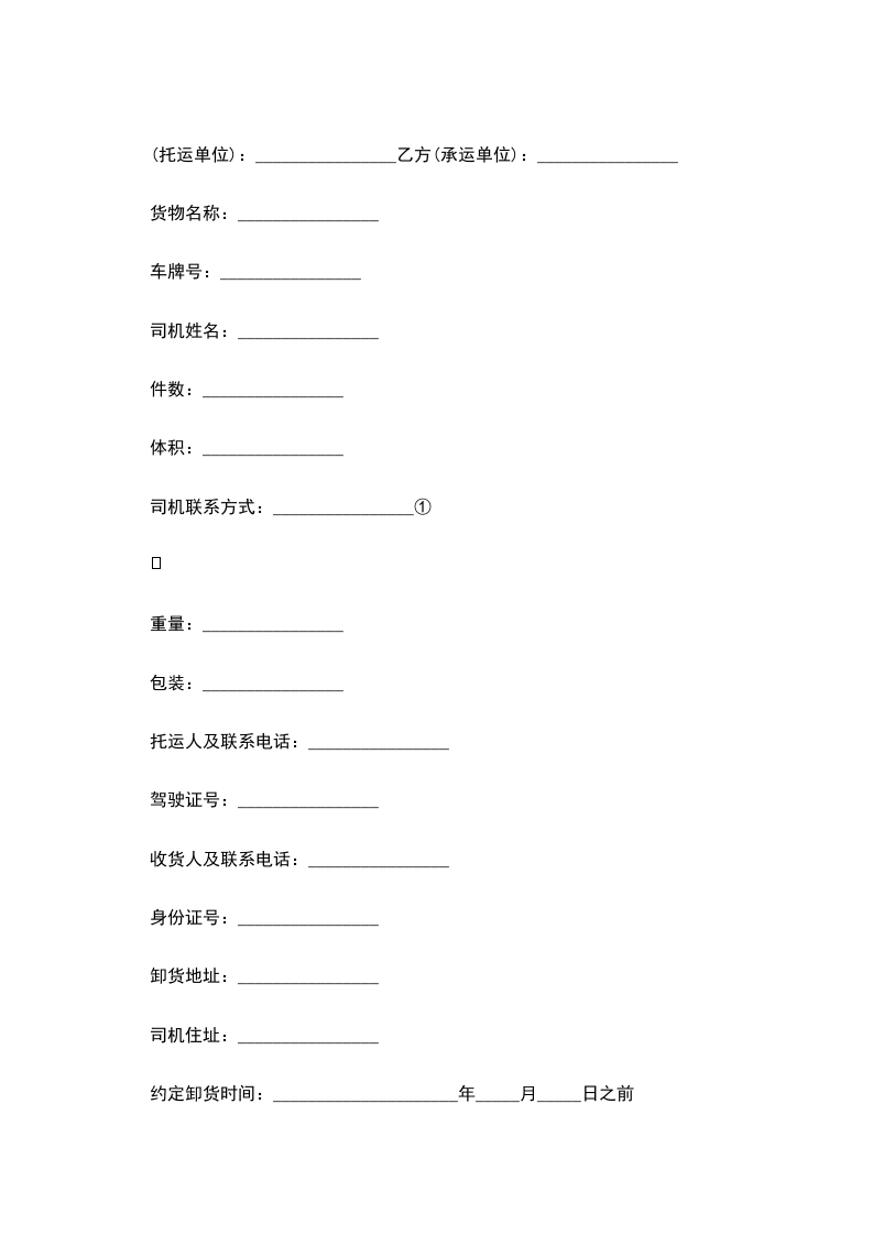 二、甲方若不跟人押车,卸货地址务必填写清楚,货物包装必须完整无损。乙方按约定卸货地址按期、完整无缺运到和办理交接货物手续,否则造成损失各负其责。