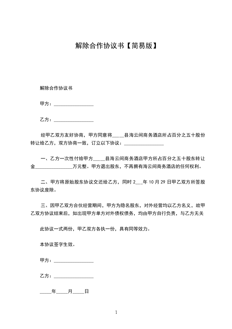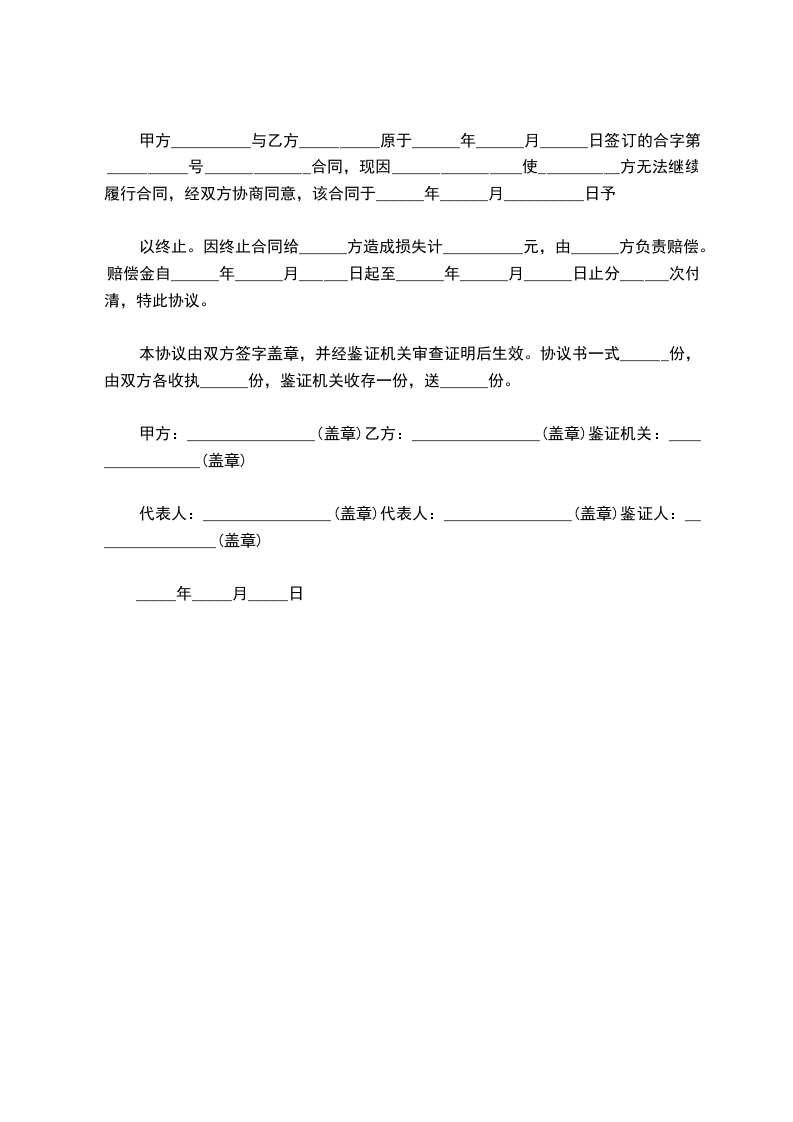 甲方__________与乙方__________原于______年______月______日签订的合字第__________号_____________合同,现因________________使__________方无法继续履行合同,经双方协商同意,该合同于______年______月__________日予