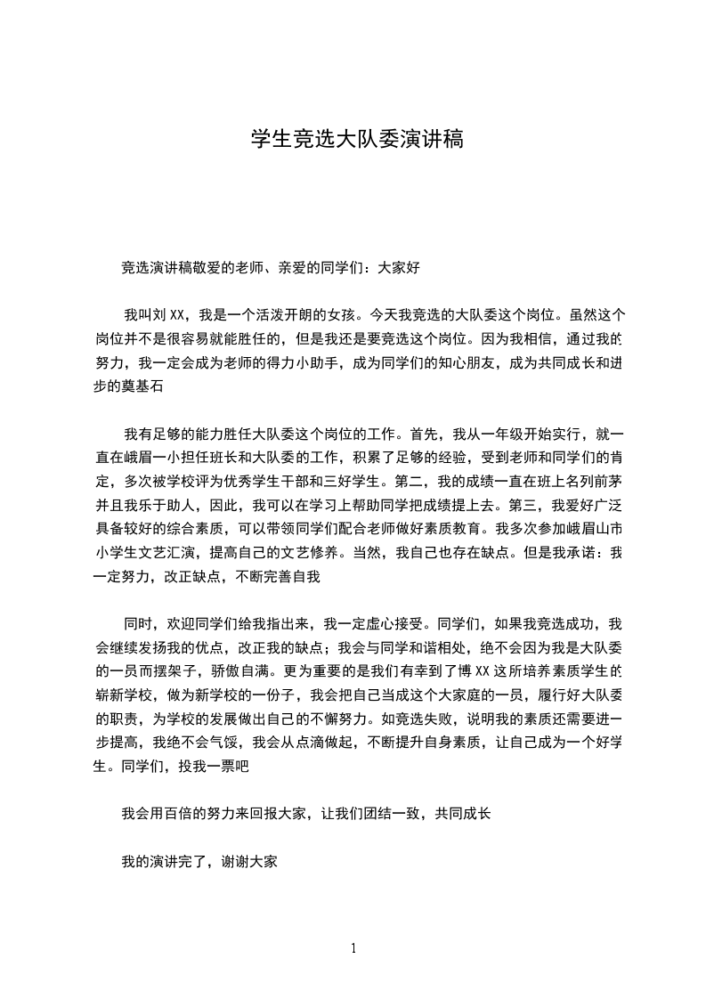 我叫刘XX,我是一个活泼开朗的女孩。今天我竞选的大队委这个岗位。虽然这个岗位并不是很容易就能胜任的,但是我还是要竞选这个岗位。因为我相信,通过我的努力,我一定会成为老师的得力小助手,成为同学们的知心朋友,成为共同成长和进步的奠基石