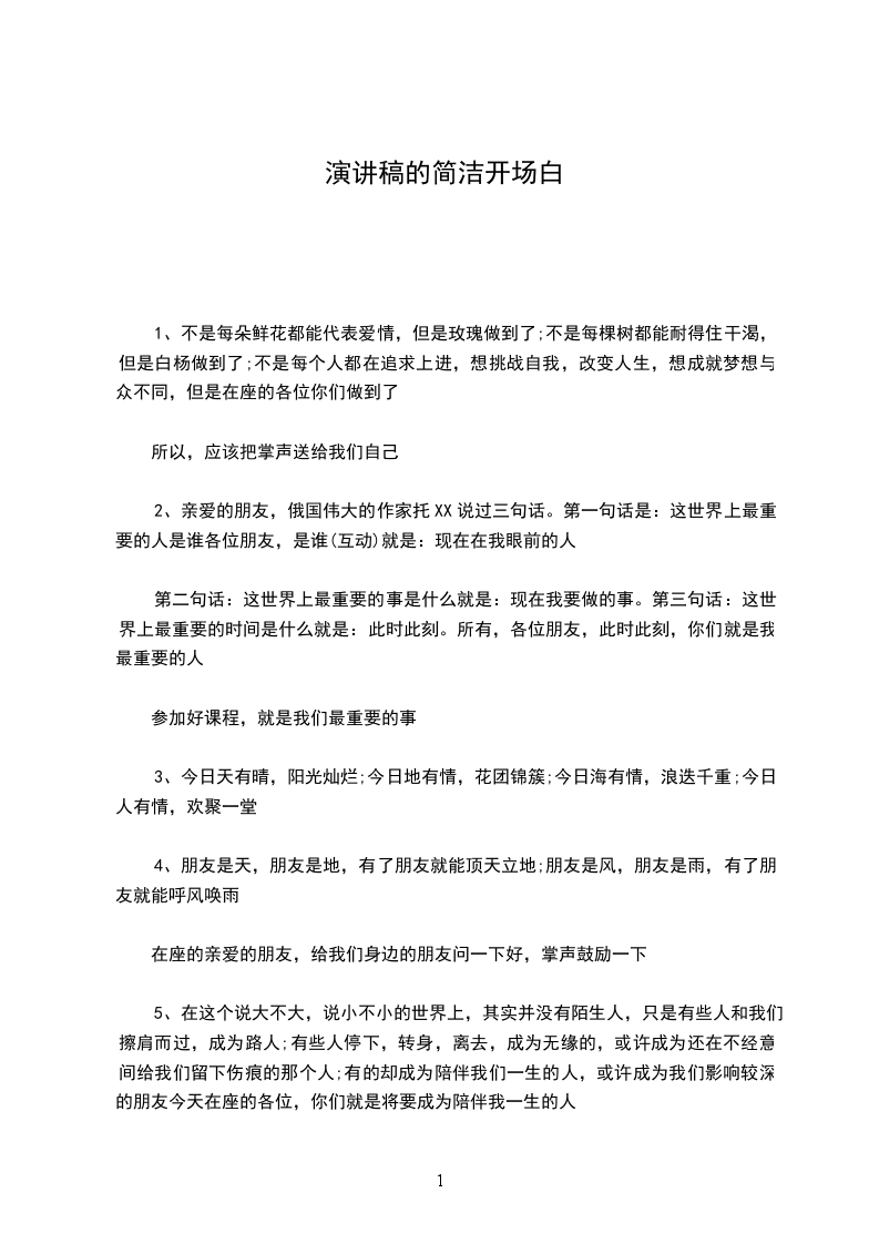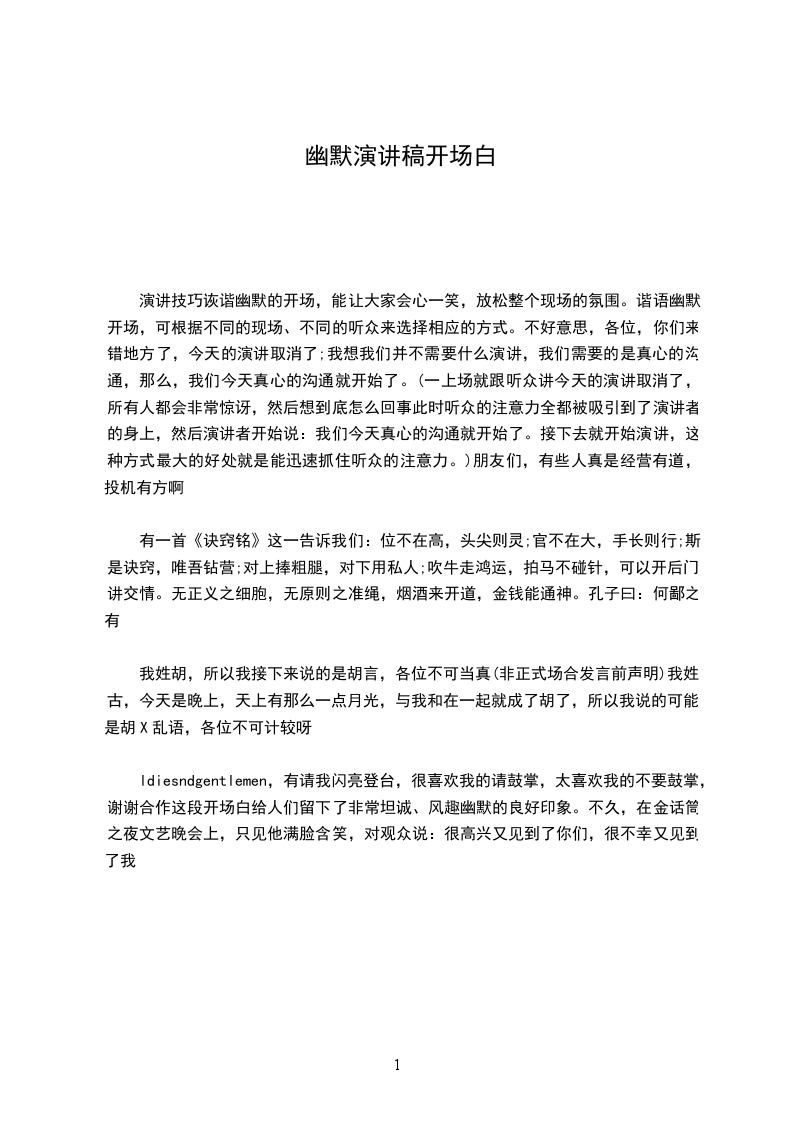 (有意识地热烈鼓掌了很长时间)。事实上,在两三天的课程中,没有顶尖的老师,只有顶尖的学生。一个人的生命只有两三天。然而,这两三天是我的生命,也是在座各位的生命。我将用我的生命与你,与你见证,并与你达成一个共同的结论。同时,我也希望你能把你的一生奉献给这两三天。学生演讲开场白幽默的开场可以让每个人微笑,放松整个场景的气氛。和声语言的幽默开场可以根据不同的场景和不同的观众来选择。抱歉,各位,你们来错地方了。今天的演讲被取消了。我认为我们不需要任何演讲,我们需要真诚的交流,那么我们真诚的交流将从今天开始。(我一上台,就告诉观众今天的演讲取消了。每个人都会很惊讶,然后想想发生了什么。这时,听众的注意力都被演讲者吸引住了,然后演讲者开始说:"我们真诚的交流从今天开始。"这种方法的最大优点是它能迅速引起观众的注意。)朋友们,有些人真的很擅长管理和投机。有首歌《诀窍铭》告诉我们:如果位置不高,头顶就是灵魂;官不大,手长;斯里兰卡是诀窍,只有我获得。在顶部拿着粗腿,在底部用双手;吹牛需要好运,奉承不触针,能打开后门,说友谊。没有正义的细胞,没有原则的标准,酒精和烟草被用来指引方向,金钱可以指引上帝。孔子说:“什么是卑鄙”我姓胡,所以我接下来要说的是废话。你不应该把它当回事(非正式场合发言前的声明)。我姓顾。今天是晚上,天空有一点点月光,和我在一起变成了胡。所以我说的可能是无稽之谈,你不应该在意