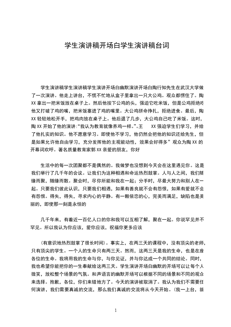 学生演讲稿学生演讲稿学生演讲开场白幽默演讲开场白陶行知先生在武汉大学做了一次演讲。他走上讲台,不慌不忙地从盒子里拿出一只大公鸡。观众都愣住了。陶XX拿出一把米饭放在桌子上。然后他按下公鸡的头,强迫它吃米饭,但是公鸡拒绝吃。他又打破了鸡的嘴,把米饭塞进了鸡的嘴里。大公鸡拼命挣扎,拒绝进食。最后,陶XX轻轻地松开手,把鸡肉放在桌子上。他后退了几步,大公鸡自己吃了米饭。这时,陶XX开始了他的演讲:“我认为教育就像养鸡一样。”。王XX强迫学生们学习,并给了他扎实的知识。他不愿意学习。即使他不学习,他仍然会把他的知识还给先生,但是如果允许他自由学习,充分发挥他的主观能动性,效果会好得多”观众为陶XX的开幕词欢呼。著名质量教育家郭XX亲爱的朋友,你好