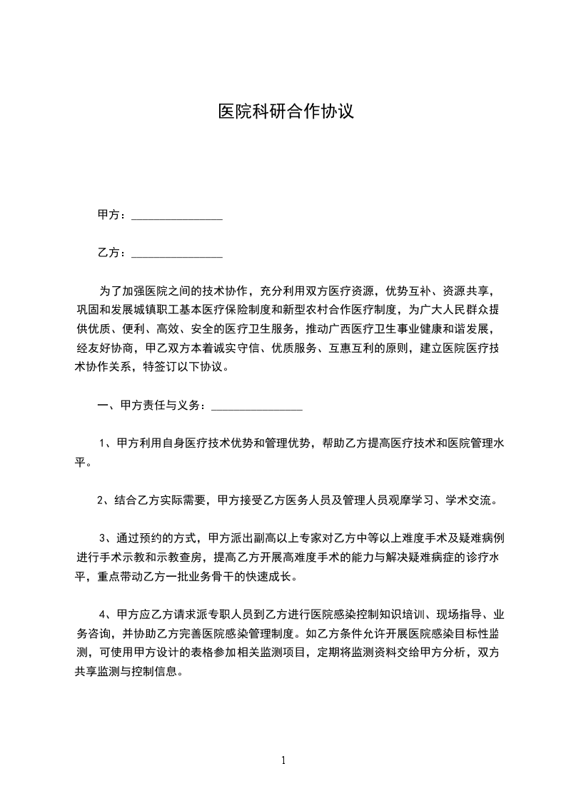 6、根据需要和可能,甲方优先与乙方开展科研合作,推广适宜医疗技术。