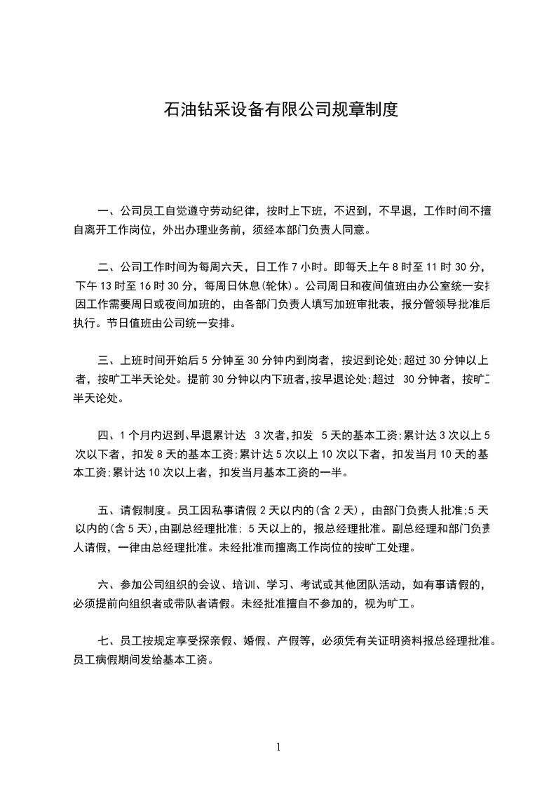 二、公司工作时间为每周六天,日工作7小时。即每天上午8时至11时30分,下午13时至16时30分,每周日休息(轮休)。公司周日和夜间值班由办公室统一安排。因工作需要周日或夜间加班的,由各部门负责人填写加班审批表,报分管领导批准后执行。节日值班由公司统一安排。