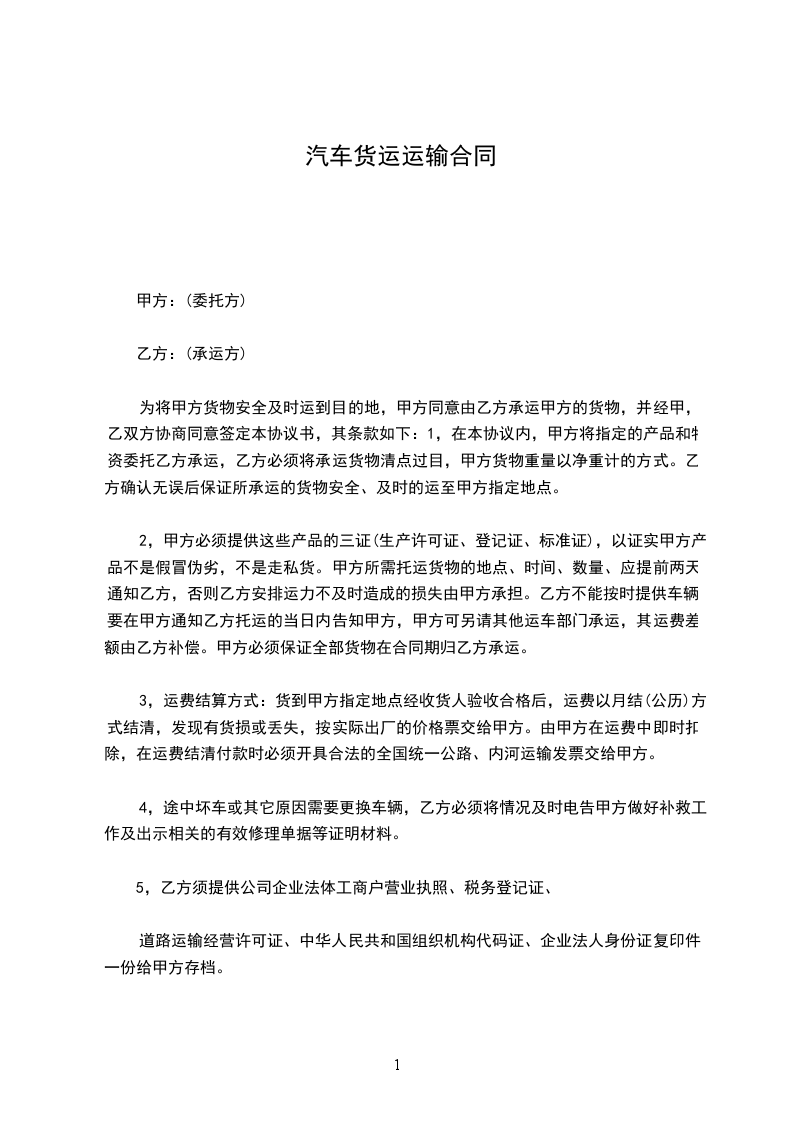 为将甲方货物安全及时运到目的地,甲方同意由乙方承运甲方的货物,并经甲,乙双方协商同意签定本协议书,其条款如下:1,在本协议内,甲方将指定的产品和物资委托乙方承运,乙方必须将承运货物清点过目,甲方货物重量以净重计的方式。乙方确认无误后保证所承运的货物安全、及时的运至甲方指定地点。