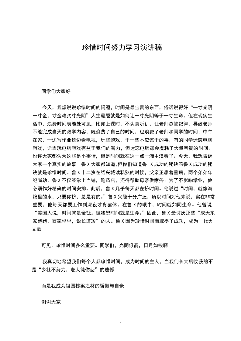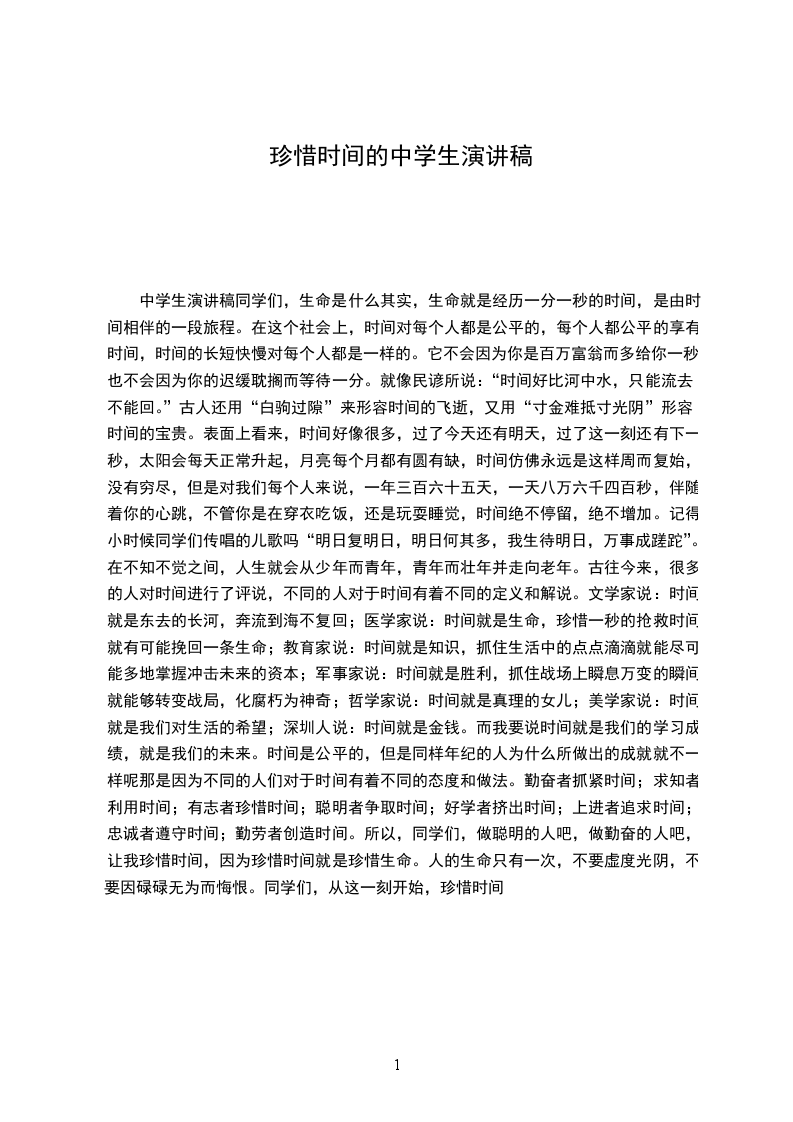中学生演讲稿同学们,生命是什么其实,生命就是经历一分一秒的时间,是由时间相伴的一段旅程。在这个社会上,时间对每个人都是公平的,每个人都公平的享有时间,时间的长短快慢对每个人都是一样的。它不会因为你是百万富翁而多给你一秒,也不会因为你的迟缓耽搁而等待一分。就像民谚所说:“时间好比河中水,只能流去不能回。”古人还用“白驹过隙”来形容时间的飞逝,又用“寸金难抵寸光阴”形容时间的宝贵。表面上看来,时间好像很多,过了今天还有明天,过了这一刻还有下一秒,太阳会每天正常升起,月亮每个月都有圆有缺,时间仿佛永远是这样周而复始,没有穷尽,但是对我们每个人来说,一年三百六十五天,一天八万六千四百秒,伴随着你的心跳,不管你是在穿衣吃饭,还是玩耍睡觉,时间绝不停留,绝不增加。记得小时候同学们传唱的儿歌吗“明日复明日,明日何其多,我生待明日,万事成蹉跎”。在不知不觉之间,人生就会从少年而青年,青年而壮年并走向老年。古往今来,很多的人对时间进行了评说,不同的人对于时间有着不同的定义和解说。文学家说:时间就是东去的长河,奔流到海不复回;医学家说:时间就是生命,珍惜一秒的抢救时间就有可能挽回一条生命;教育家说:时间就是知识,抓住生活中的点点滴滴就能尽可能多地掌握冲击未来的资本;军事家说:时间就是胜利,抓住战场上瞬息万变的瞬间就能够转变战局,化腐朽为神奇;哲学家说:时间就是真理的女儿;美学家说:时间就是我们对生活的希望;深圳人说:时间就是金钱。而我要说时间就是我们的学习成绩,就是我们的未来。时间是公平的,但是同样年纪的人为什么所做出的成就就不一样呢那是因为不同的人们对于时间有着不同的态度和做法。勤奋者抓紧时间;求知者利用时间;有志者珍惜时间;聪明者争取时间;好学者挤出时间;上进者追求时间;忠诚者遵守时间;勤劳者创造时间。所以,同学们,做聪明的人吧,做勤奋的人吧,让我珍惜时间,因为珍惜时间就是珍惜生命。人的生命只有一次,不要虚度光阴,不要因碌碌无为而悔恨。同学们,从这一刻开始,珍惜时间