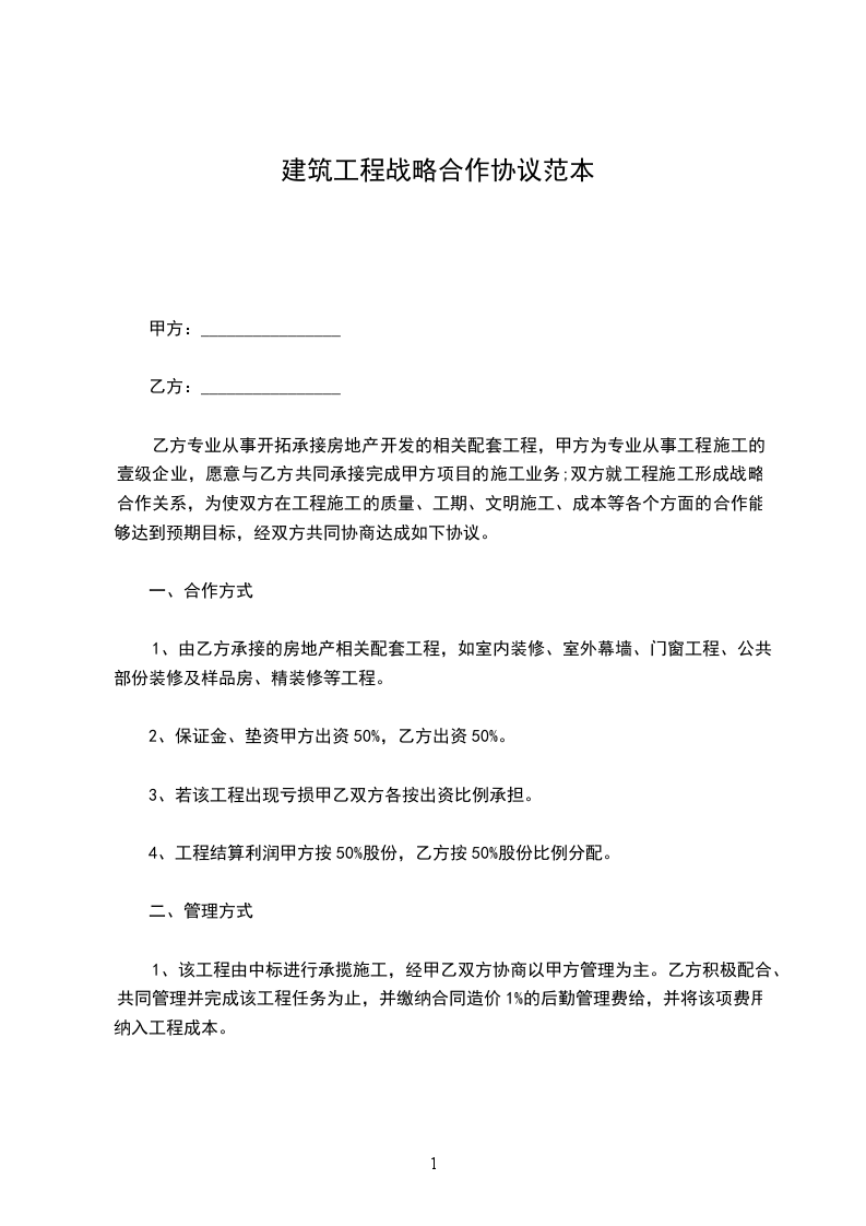 4、工程结算利润甲方按50%股份,乙方按50%股份比例分配。