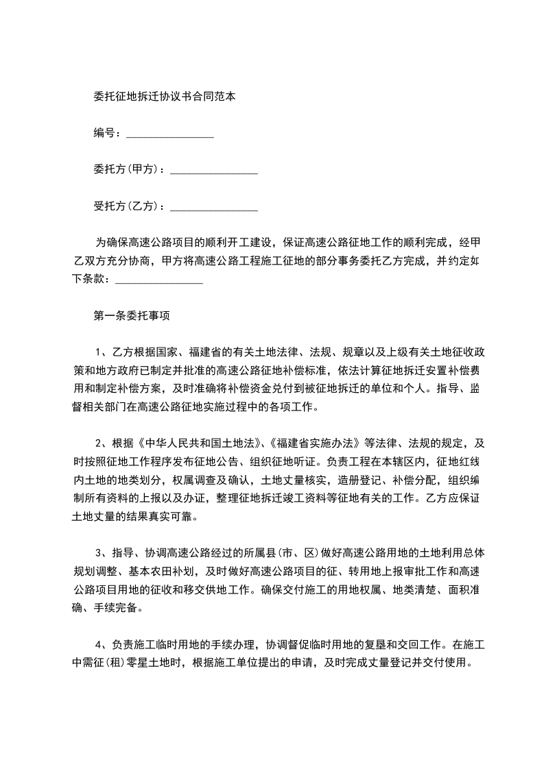 为确保高速公路项目的顺利开工建设,保证高速公路征地工作的顺利完成,经甲乙双方充分协商,甲方将高速公路工程施工征地的部分事务委托乙方完成,并约定如下条款:________________