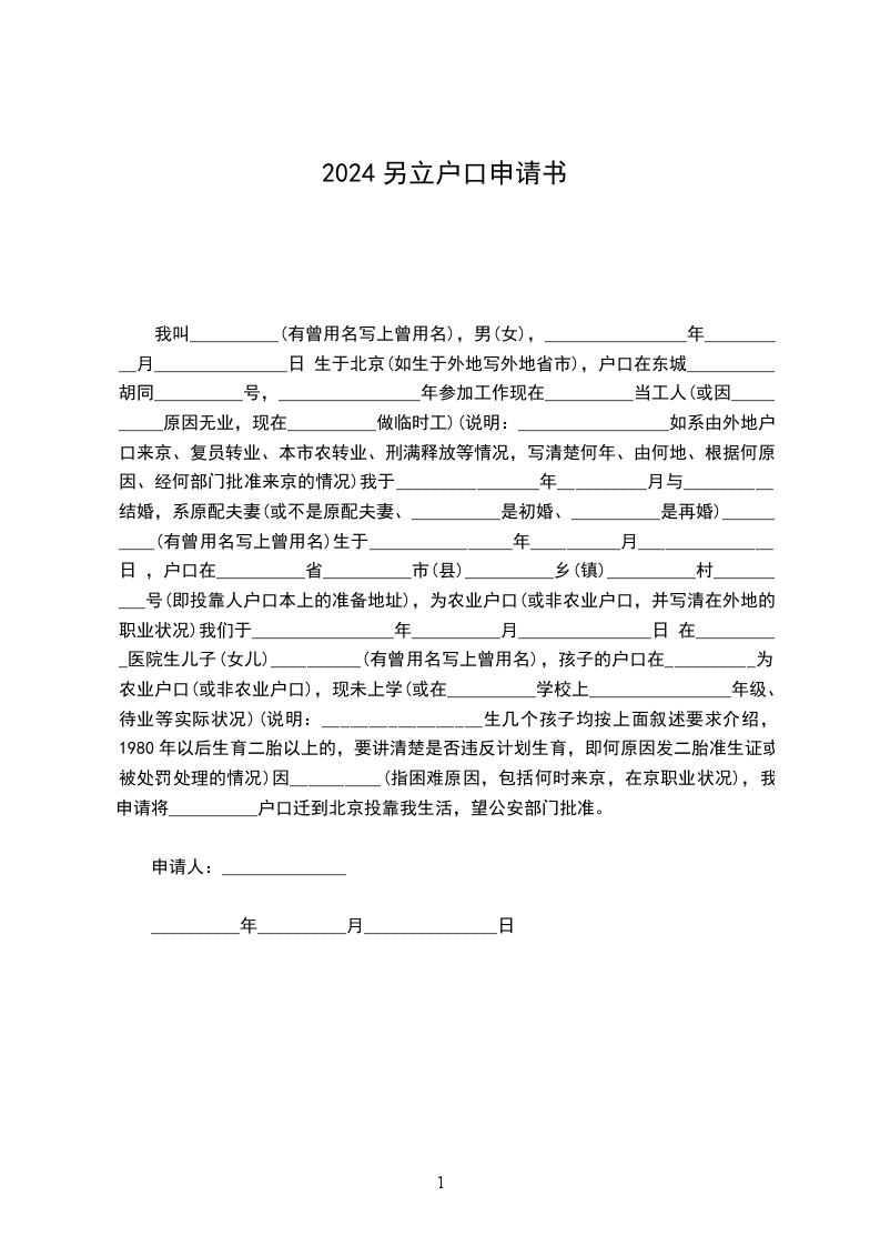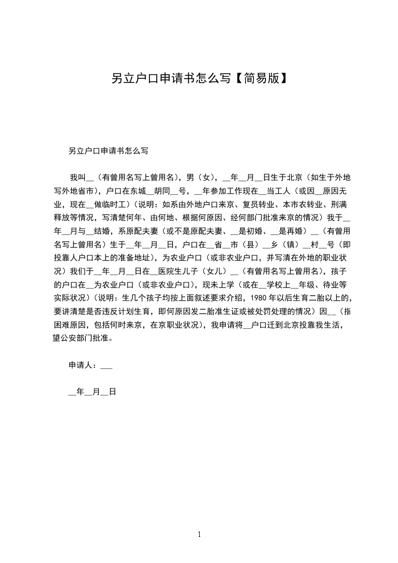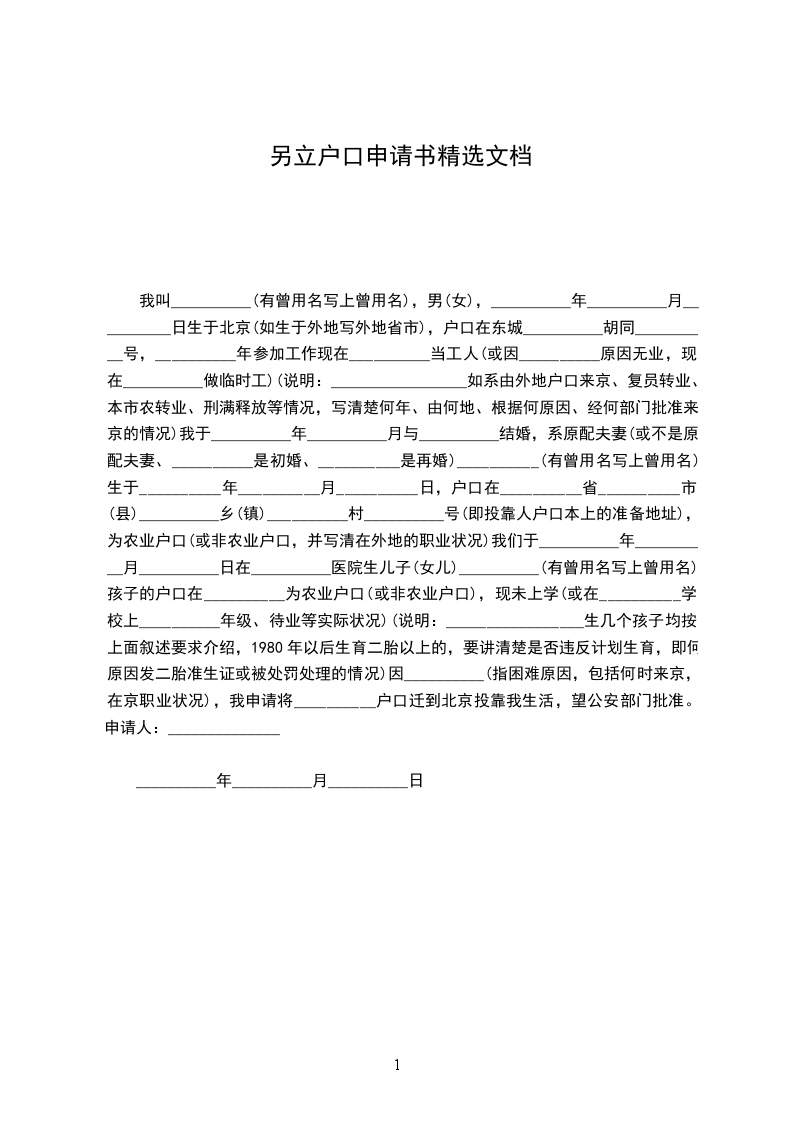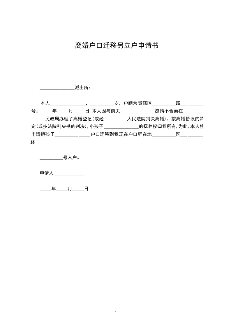 本人系******居民,我户现有5人,户主为***,户籍地址为******,本人为户主的儿子***.由于本人已经成家,居住地为******,经与父母协商一致,愿意拨户分居,分开生活。故而提出分户申请,请将本人,以及本人之妻***,本人之女***,共三人另立户,请批准为盼。