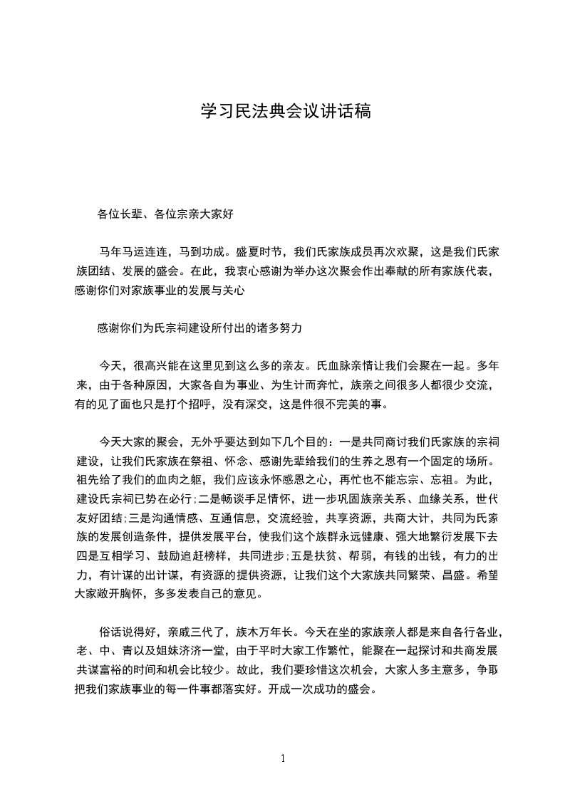 今天大家的聚会,无外乎要达到如下几个目的:一是共同商讨我们氏家族的宗祠建设,让我们氏家族在祭祖、怀念、感谢先辈给我们的生养之恩有一个固定的场所。祖先给了我们的血肉之躯,我们应该永怀感恩之心,再忙也不能忘宗、忘祖。为此,建设氏宗祠已势在必行;二是畅谈手足情怀,进一步巩固族亲关系、血缘关系,世代友好团结;三是沟通情感、互通信息,交流经验,共享资源,共商大计,共同为氏家族的发展创造条件,提供发展平台,使我们这个族群永远健康、强大地繁衍发展下去;四是互相学习、鼓励追赶榜样,共同进步;五是扶贫、帮弱,有钱的出钱,有力的出力,有计谋的出计谋,有资源的提供资源,让我们这个大家族共同繁荣、昌盛。希望大家敞开胸怀,多多发表自己的意见。