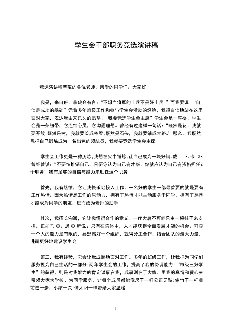 各位学长学姐们:你们好,我是文学院对外汉语一班的某某某,我现在要竞选的是学生会生活部干事。在高中三年,我一直担任班里的学生干部,这让我积累了一些协调各方面矛盾的经验,并具备了一定的组织和管理能力。但诚然,作为一名大一新生,我对学生会的认识还不够全面和深入。但我相信:合抱之木,起于毫末。五尺之台,起于垒土。万事万物都是从无到有,从小到大一点一点积累起来的。我完全相信,凭着我的激情,我的努力和我的认真,我一定可以将工作做好。同事,我是一个比较有责任感和奉献精神的人,做事脚踏实地,不怕辛苦。我认为对于生活部干事来说,这些都能让我更好地完成任务。座位一名学生,学习是我们的第一要务,所以如果我竞选上生活部干事,我首先要做好的就是协调好学习和工作,而我自信我能够做到,不让自己陷入要么挂科要么完不成任务的境地中。如果我竞选上我会组织对学生宿舍的定期检查,监督引导广大同学养成良好的生活习惯。同时适时开展各楼层间的交流活动,不是向同学宣传一些生活小知识,丰富和发展校园宿舍文化。并通过各宿舍长及时了解并帮助解决同学们日常生活遇到的问题。另外,我还会组织对校园各食堂,超市的定期检查,加强对校园食品安全的监督和管理。接受同学的意见和建议,并及时向后勤部门反映并解决。学生会是培养组织能力,沟通能力和领导能力的地方,这也是我之所以参加应聘的主要原因,我希望能在生活部这个大家庭中发挥自己的长处,并提高自己。有人的地方就有生活,有生活的地方要有生活部,我希望有生活部的地方就有我。我相信,我的加入,将会是生活部又一抹明亮的色彩。我引生活部更闪亮,生活部有我更美丽。谢谢