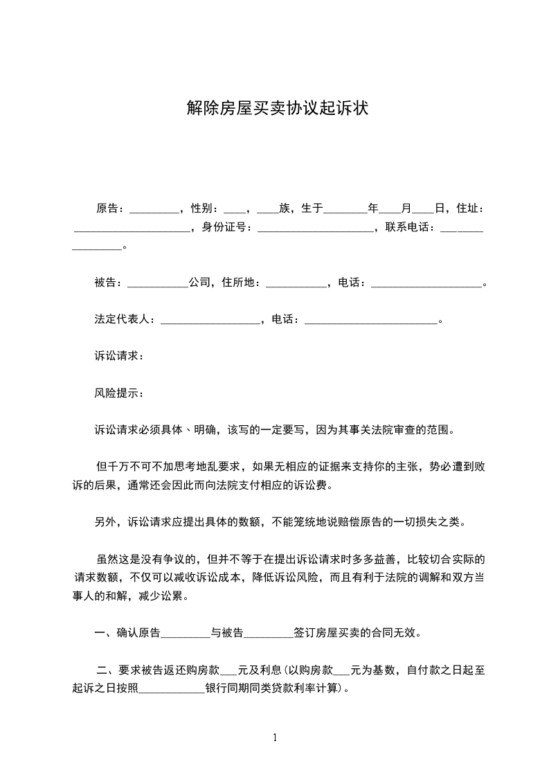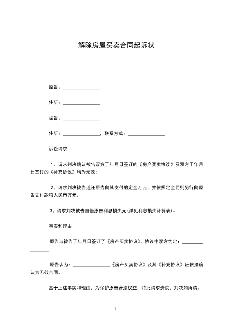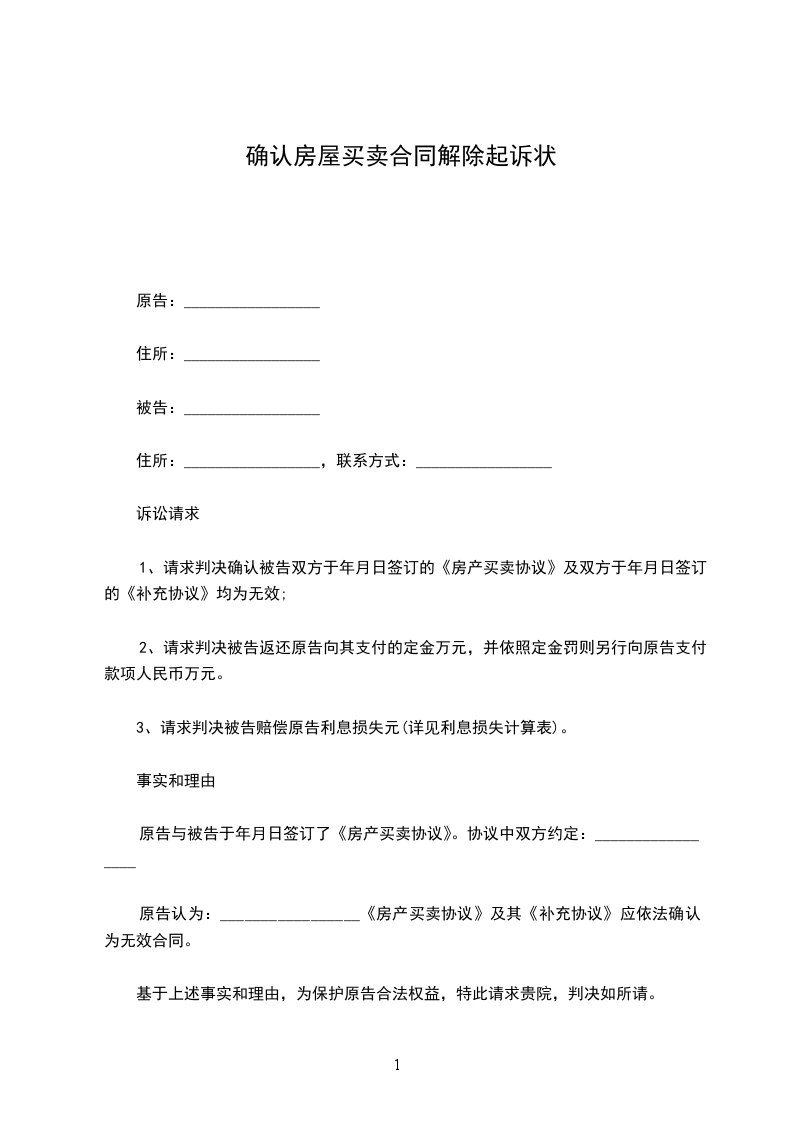 1、请求判决确认被告双方于______年____月____日签订的《房产买卖协议》及双方于______年____月____日签订的《补充协议》均为无效;