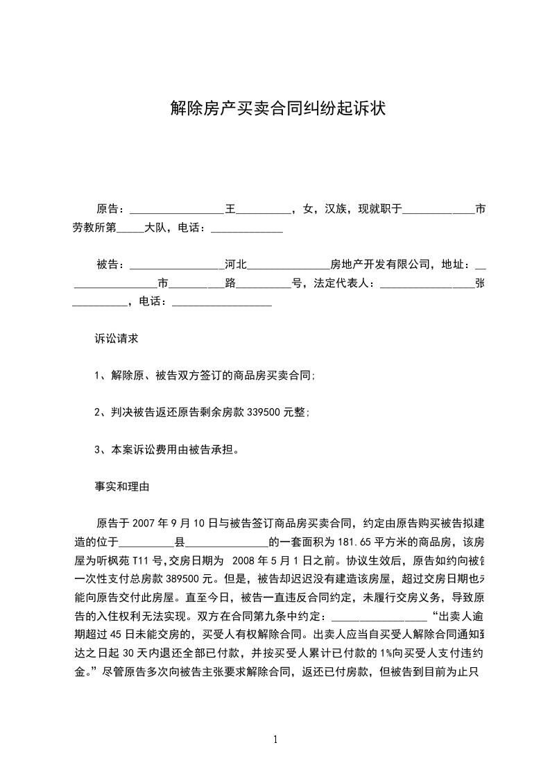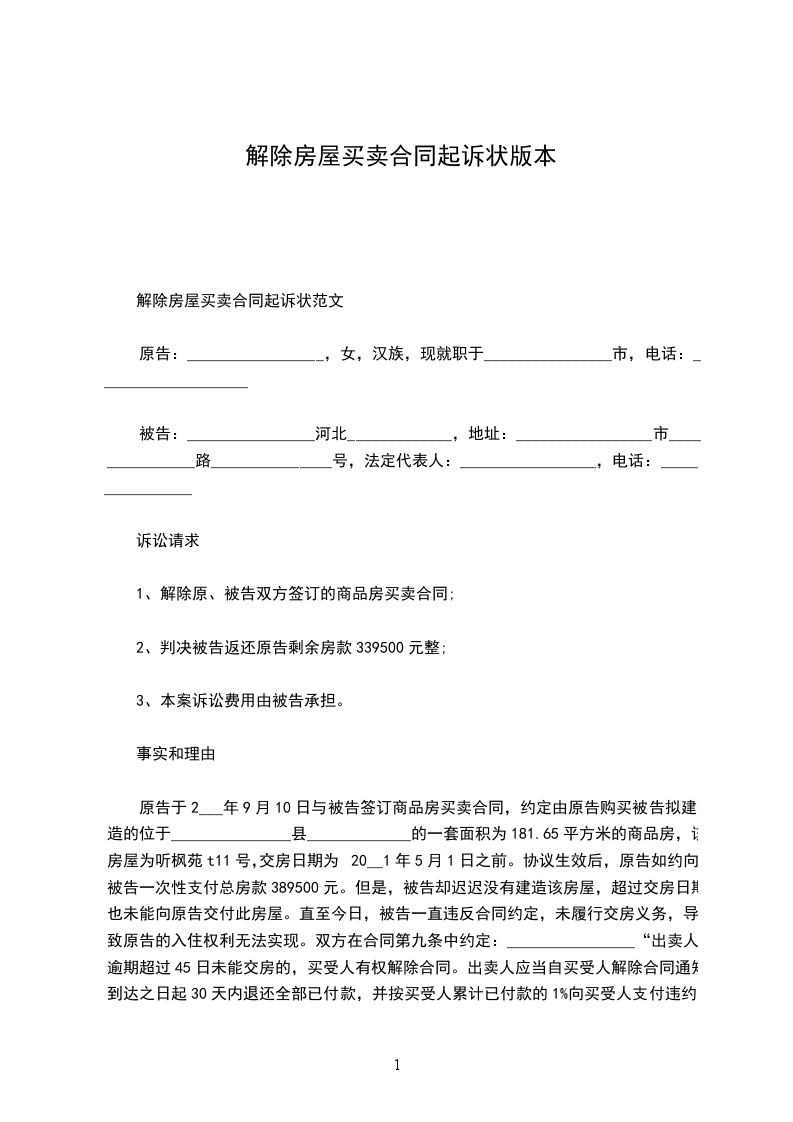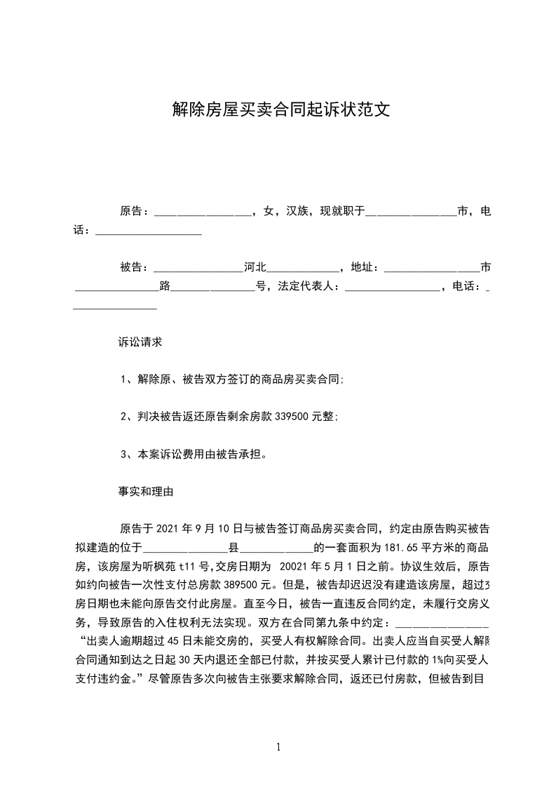 原告于2024年9月10日与被告签订商品房买卖合同,约定由原告购买被告拟建造的位于_______________县_____________的一套面积为181.65平方米的商品房,该房屋为听枫苑t11号,交房日期为20021年5月1日之前。协议生效后,原告如约向被告一次性支付总房款389500元。但是,被告却迟迟没有建造该房屋,超过交房日期也未能向原告交付此房屋。直至今日,被告一直违反合同约定,未履行交房义务,导致原告的入住权利无法实现。双方在合同第九条中约定:________________“出卖人逾期超过45日未能交房的,买受人有权解除合同。出卖人应当自买受人解除合同通知到达之日起30天内退还全部已付款,并按买受人累计已付款的1%向买受人支付违约金。”尽管原告多次向被告主张要求解除合同,返还已付房款,但被告到目前为止只返还给原告房款50000元,迟迟不予返还剩余房款,未能承担相应的违约责任。现诉诸法院,请求法院判如所求!