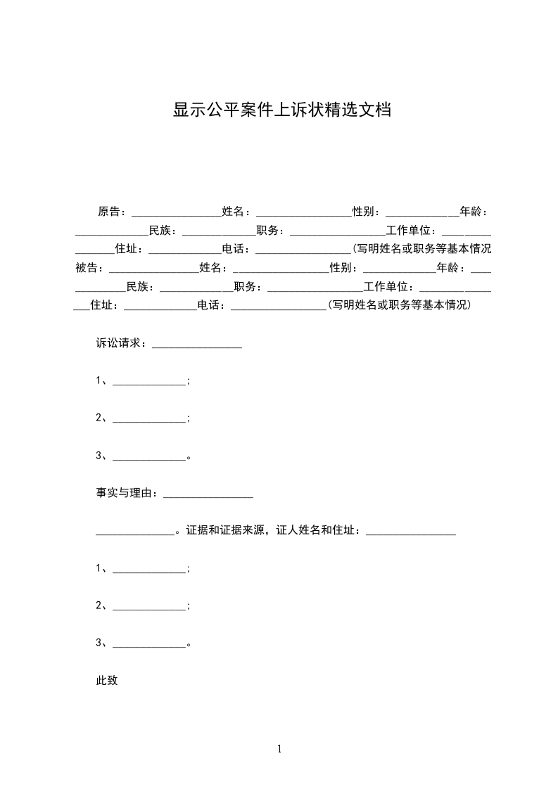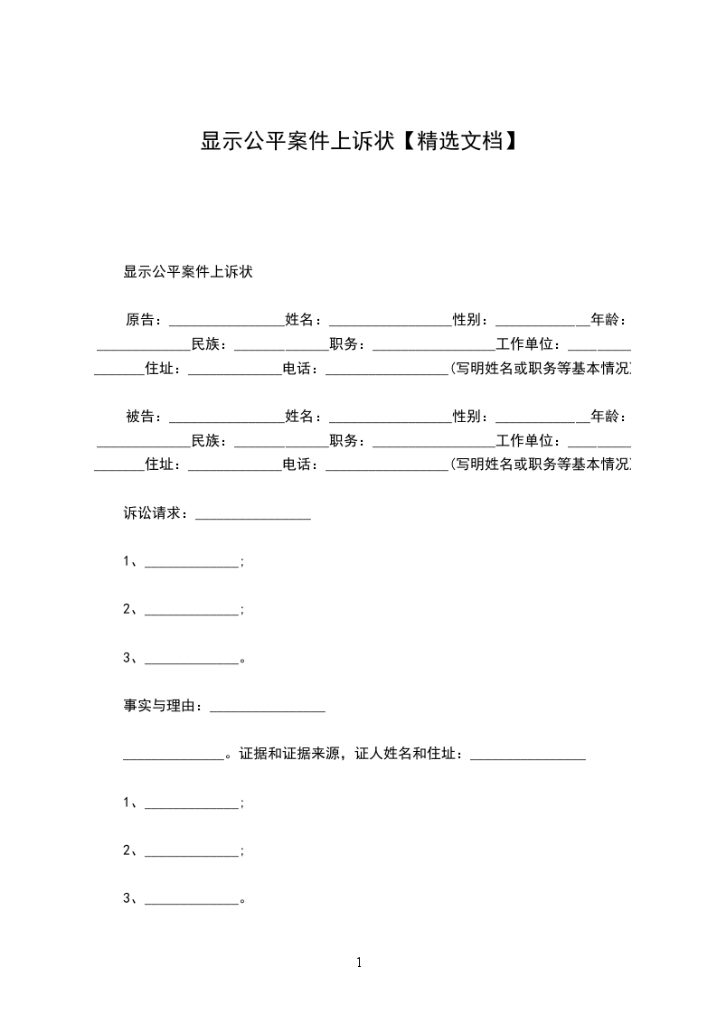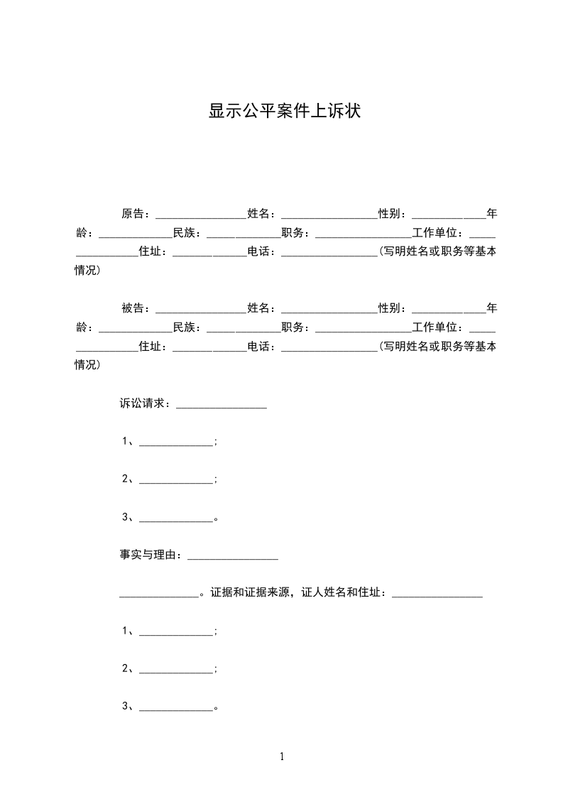 原告:________________姓名:_________________性别:_____________年龄:_____________民族:_____________职务:_________________工作单位:________________住址:_____________电话:_________________(写明姓名或职务等基本情况)