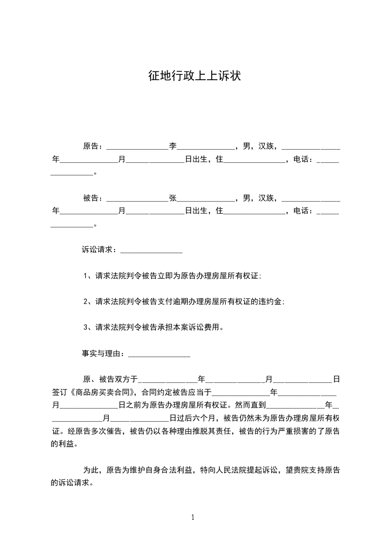 原告:________________李_______________,男,汉族,_______________年_______________月_______________日出生,住________________,电话:_________________。