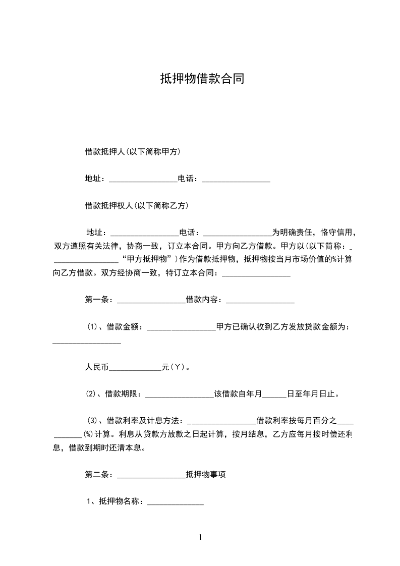 地址:_________________电话:_________________为明确责任,恪守信用,双方遵照有关法律,协商一致,订立本合同。甲方向乙方借款。甲方以(以下简称:_________________“甲方抵押物”)作为借款抵押物,抵押物按当月市场价值的_____%计算,向乙方借款。双方经协商一致,特订立本合同:_________________