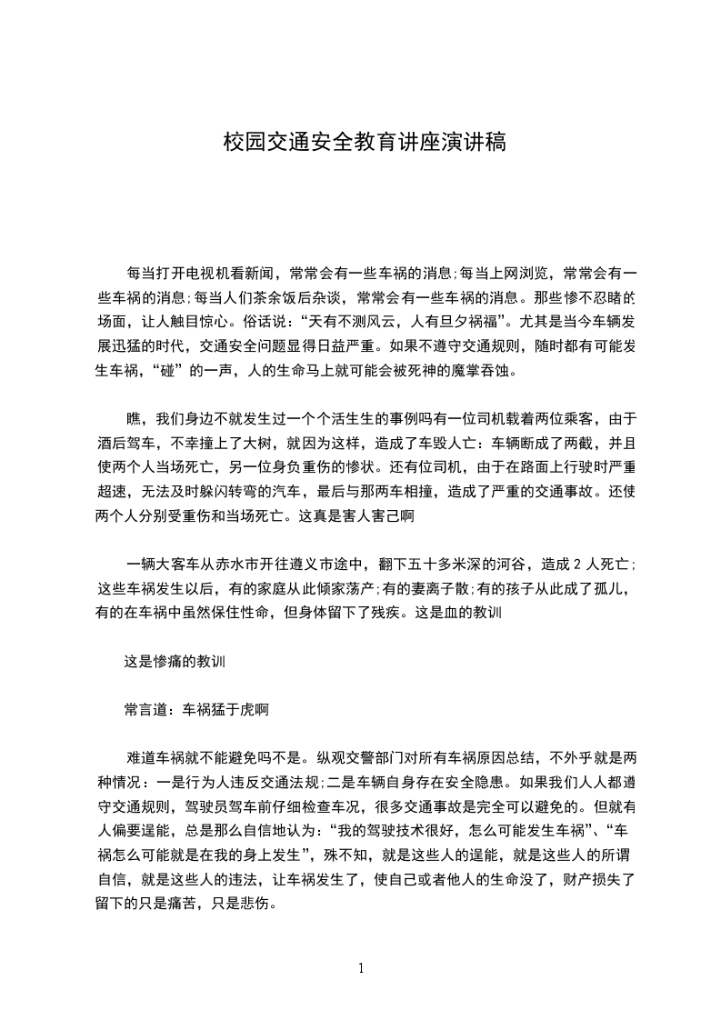 每当打开电视机看新闻,常常会有一些车祸的消息;每当上网浏览,常常会有一些车祸的消息;每当人们茶余饭后杂谈,常常会有一些车祸的消息。那些惨不忍睹的场面,让人触目惊心。俗话说:“天有不测风云,人有旦夕祸福”。尤其是当今车辆发展迅猛的时代,交通安全问题显得日益严重。如果不遵守交通规则,随时都有可能发生车祸,“碰”的一声,人的生命马上就可能会被死神的魔掌吞蚀。