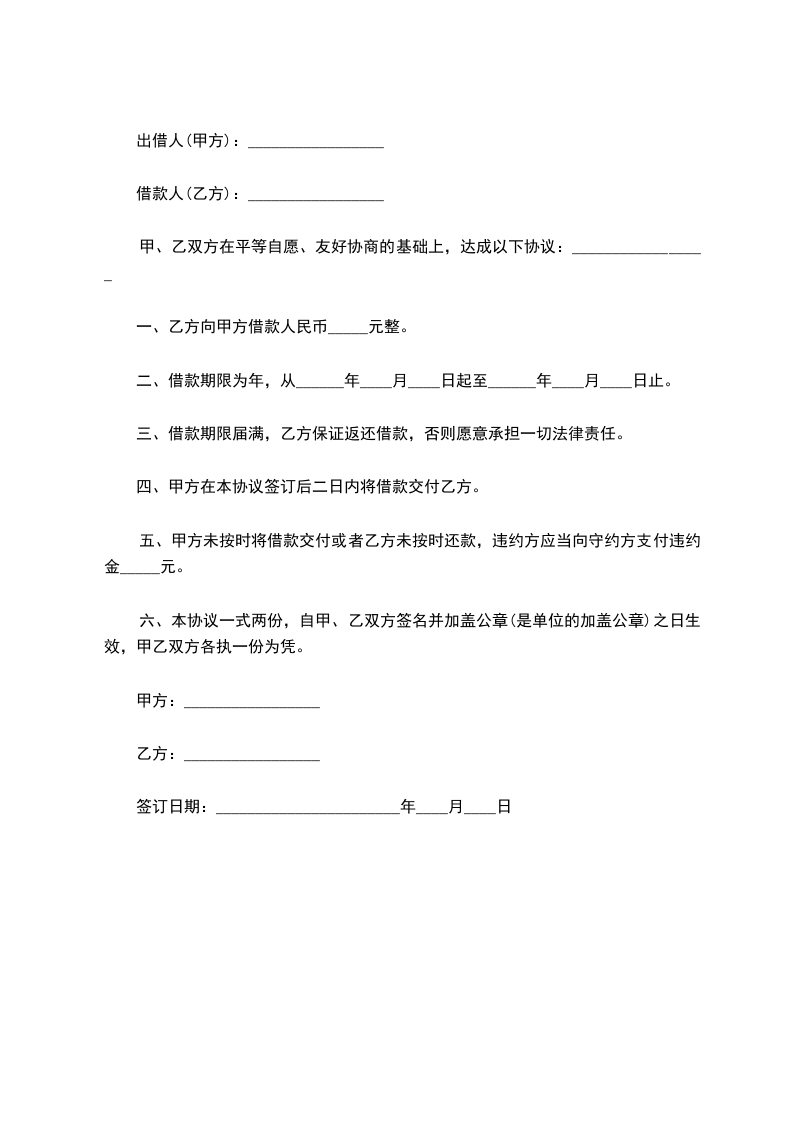 五、甲方未按时将借款交付或者乙方未按时还款,违约方应当向守约方支付违约金_____元。