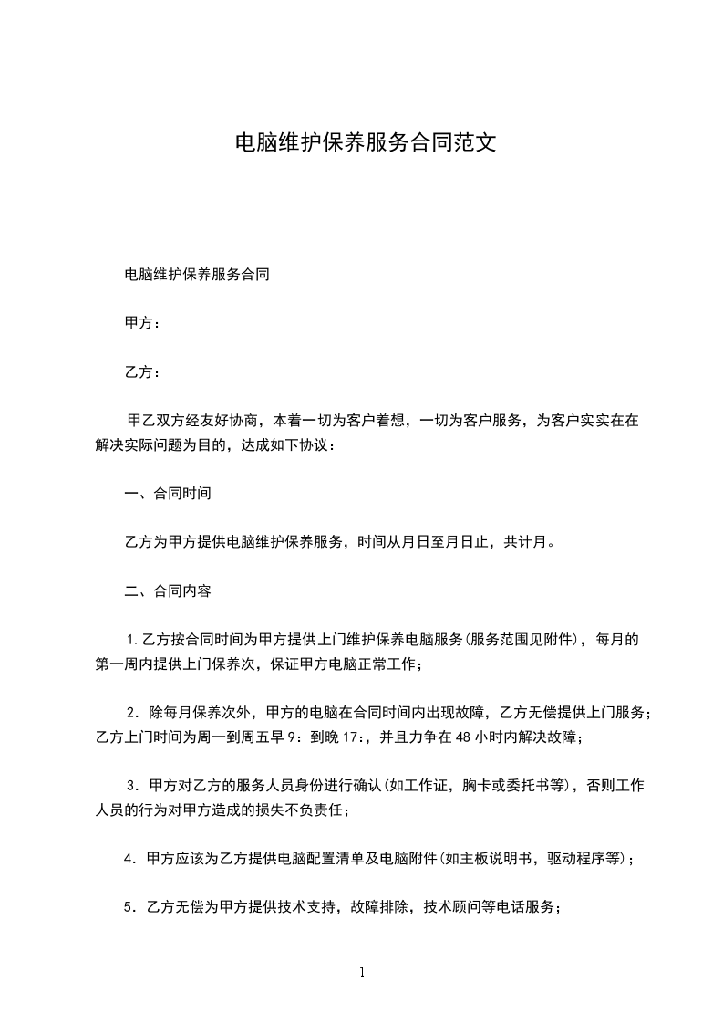 1.乙方按合同时间为甲方提供上门维护保养电脑服务(服务范围见附件),每月的第一周内提供上门保养次,保证甲方电脑正常工作;