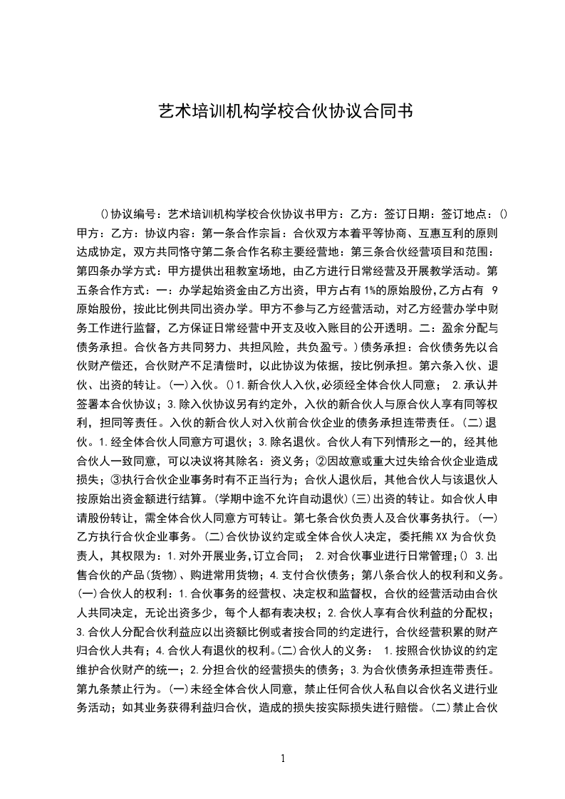()协议编号:艺术培训机构学校合伙协议书甲方:乙方:签订日期:签订地点:()甲方:乙方:协议内容:第一条合作宗旨:合伙双方本着平等协商、互惠互利的原则达成协定,双方共同恪守第二条合作名称主要经营地:第三条合伙经营项目和范围:第四条办学方式:甲方提供出租教室场地,由乙方进行日常经营及开展教学活动。第五条合作方式:一:办学起始资金由乙方出资,甲方占有1%的原始股份,乙方占有9%原始股份,按此比例共同出资办学。甲方不参与乙方经营活动,对乙方经营办学中财务工作进行监督,乙方保证日常经营中开支及收入账目的公开透明。二:盈余分配与债务承担。合伙各方共同努力、共担风险,共负盈亏。)债务承担:合伙债务先以合伙财产偿还,合伙财产不足清偿时,以此协议为依据,按比例承担。第六条入伙、退伙、出资的转让。(一)入伙。()1.新合伙人入伙,必须经全体合伙人同意;2.承认并签署本合伙协议;3.除入伙协议另有约定外,入伙的新合伙人与原合伙人享有同等权利,担同等责任。入伙的新合伙人对入伙前合伙企业的债务承担连带责任。(二)退伙。1.经全体合伙人同意方可退伙;3.除名退伙。合伙人有下列情形之一的,经其他合伙人一致同意,可以决议将其除名:资义务;②因故意或重大过失给合伙企业造成损失;③执行合伙企业事务时有不正当行为;合伙人退伙后,其他合伙人与该退伙人按原始出资金额进行结算。(学期中途不允许自动退伙)(三)出资的转让。如合伙人申请股份转让,需全体合伙人同意方可转让。第七条合伙负责人及合伙事务执行。(一)乙方执行合伙企业事务。(二)合伙协议约定或全体合伙人决定,委托熊XX为合伙负责人,其权限为:1.对外开展业务,订立合同;2.对合伙事业进行日常管理;()3.出售合伙的产品(货物)、购进常用货物;4.支付合伙债务;第八条合伙人的权利和义务。(一)合伙人的权利:1.合伙事务的经营权、决定权和监督权,合伙的经营活动由合伙人共同决定,无论出资多少,每个人都有表决权;2.合伙人享有合伙利益的分配权;3.合伙人分配合伙利益应以出资额比例或者按合同的约定进行,合伙经营积累的财产归合伙人共有;4.合伙人有退伙的权利。(二)合伙人的义务:1.按照合伙协议的约定维护合伙财产的统一;2.分担合伙的经营损失的债务;3.为合伙债务承担连带责任。第九条禁止行为。(一)未经全体合伙人同意,禁止任何合伙人私自以合伙名义进行业务活动;如其业务获得利益归合伙,造成的损失按实际损失进行赔偿。(二)禁止合伙人参与经营与本合伙竞争的业务;(三)合伙人不得从事损害本合伙企业利益的活动。第十条合伙的终止和清算。()(一)合伙因下列情形解散:1.全体合伙人同意终止合伙关系;(二)合伙的清算:1.合伙解散后应当进行清算,并通知债权人。2.清算人由全体合伙人担任或经全体合伙人过半数同意,第十一条违约责任。(一)合伙人未按期缴纳或未缴足出资的,应当赔偿由此给其他合伙人造成的损失;如果逾期三个月仍未缴足出资,按退伙处理。(二)合伙人未经其他合伙人一致同意而转让其财产份额的,如果他合伙人不愿接纳受让人为新的合伙人,可按退伙处理,转让人应赔偿其他合伙人因此而造成的损失。(三)本合同一式份,合伙人各执一份,送登记机关存档一份。(四)本合同经全体合伙人签名、盖章后生效。合伙人:(签章)签约时间:月日