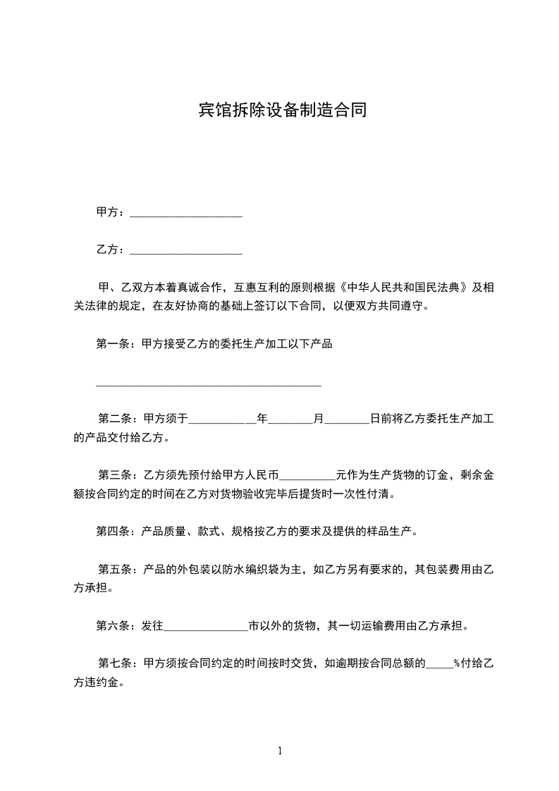 第一条:甲方接受乙方的委托生产加工以下产品