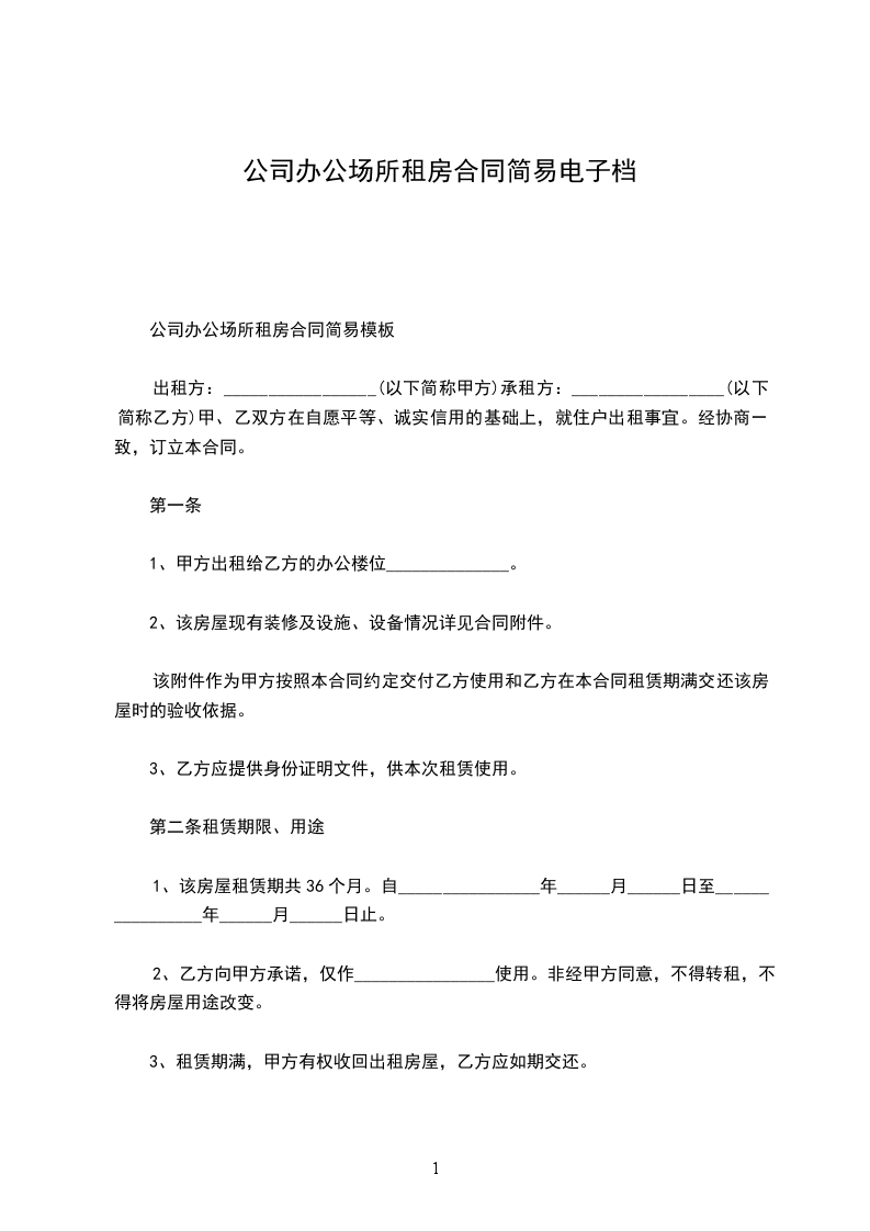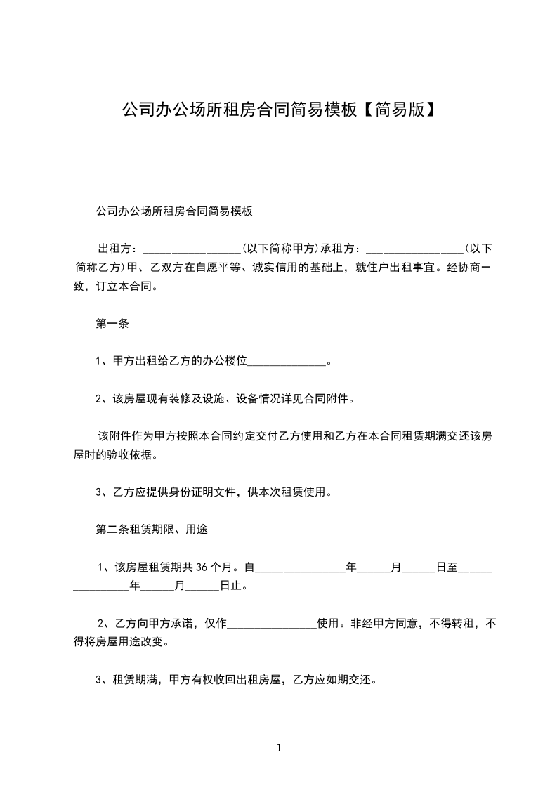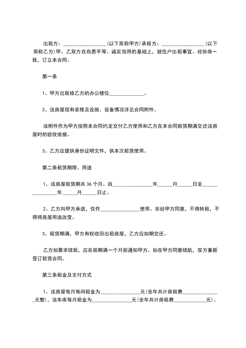 1、该房屋租赁期共36个月。自________________年______月______日至________________年______月______日止。