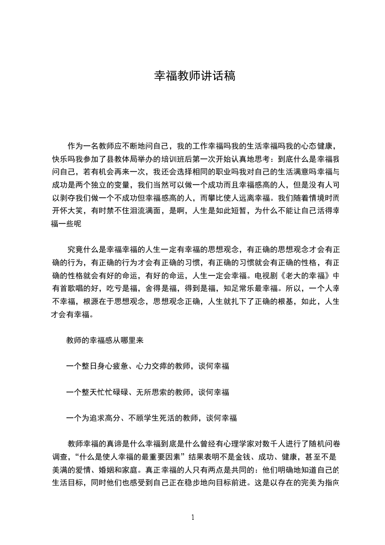 作为一名教师应不断地问自己,我的工作幸福吗我的生活幸福吗我的心态健康,快乐吗我参加了县教体局举办的培训班后第一次开始认真地思考:到底什么是幸福我问自己,若有机会再来一次,我还会选择相同的职业吗我对自己的生活满意吗幸福与成功是两个独立的变量,我们当然可以做一个成功而且幸福感高的人,但是没有人可以剥夺我们做一个不成功但幸福感高的人,而攀比使人远离幸福。我们随着情境时而开怀大笑,有时禁不住泪流满面,是啊,人生是如此短暂,为什么不能让自己活得幸福一些呢