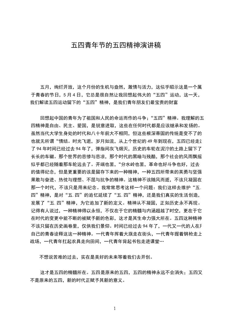 回想起中国的青年为了祖国和人民的命运而作的斗争;“五四”精神。我理解的五四精神是自由、民主、爱国,是锐意进取,这些在任何时代都是应该继承和发扬的。虽然当代大学生身处的时代和八十年前大不相同,但这些根深蒂固的传统是变不了的,也就无所谓“情结。时光飞逝,岁月如流,从上个世纪的49年到现在,五四已经走过了94年时间已经过去94年了,弹指间灰飞烟灭,历史的车轮在泥泞的土路上留下了长长的车辙。那个世界的悲惨与悲凉,那个时代的黑暗与残酷,那个社会的风雨飘摇,似乎都已经随着那车轮远去了。开端也罢,“分水岭也罢,革命也好斗争也好,过去的值得纪念,但是更重要的该是留存下来的一种精神,一种五四所带来的英勇与坚强、果敢与奋进、热忱与理想、不屈与抗争的精神。这精神不该随风而逝,不该只凝固在那一个时代,不该只是用来纪念。我常常思考这样一个问题:我们这样去维护“五.四”精神,是对“五.四”的追忆延续了“五.四”精神,还是我们真实的生活创造,发展了“五.四”精神,为它追加了新的定义。精神从不凝固,正如历史永不再现。记得有人说过,一种精神得以永恒,不仅在于它的精髓与内涵超越了时空,更在于它在时代的变更中能不断的被赋予新的色彩,这才是其生命力强大所在。五四这种精神不该只留在历史画卷里,仅供我们景仰。时间已经过去94年了,一代又一代的人在用自己的青春诠释这这一种精神。一代青年挥着大旗走在街头,一代青年握着钢枪走上战场,一代青年扛起农具走向田间,一代青年背起书包走进课堂…