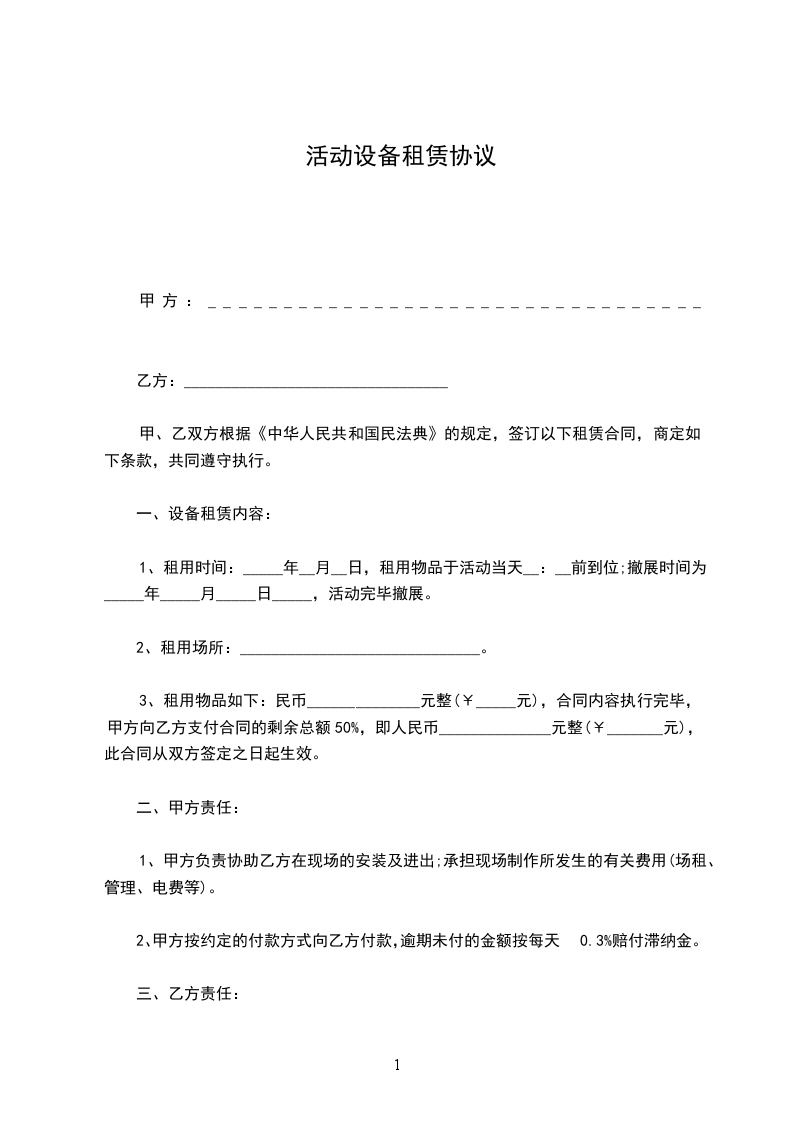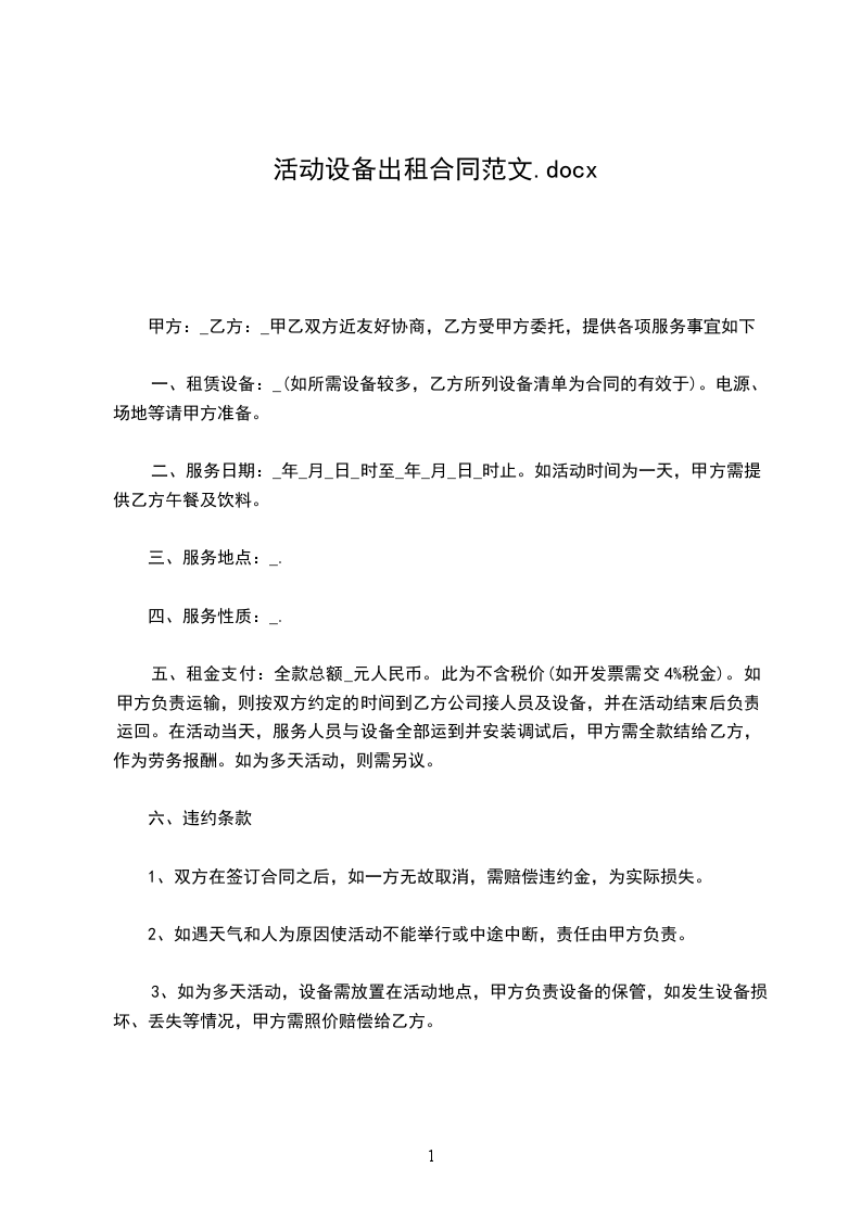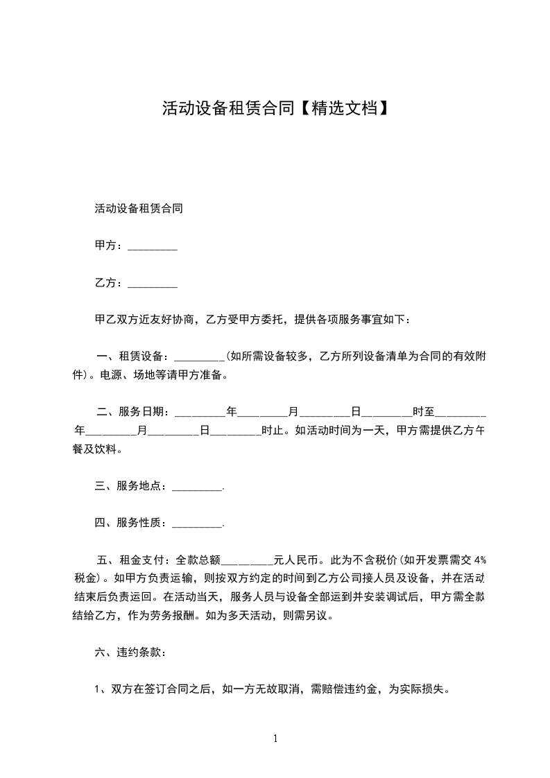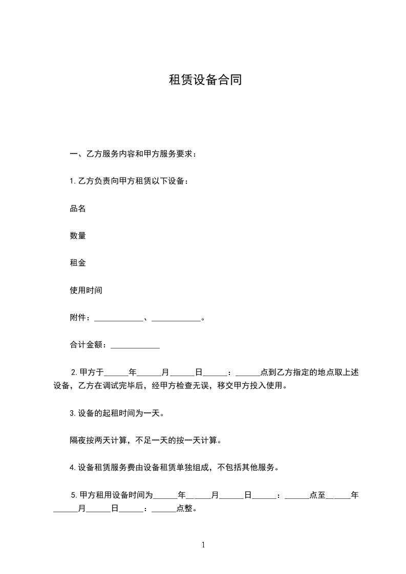 一、租赁设备:_________(如所需设备较多,乙方所列设备清单为合同的有效附件)。电源、场地等请甲方准备。